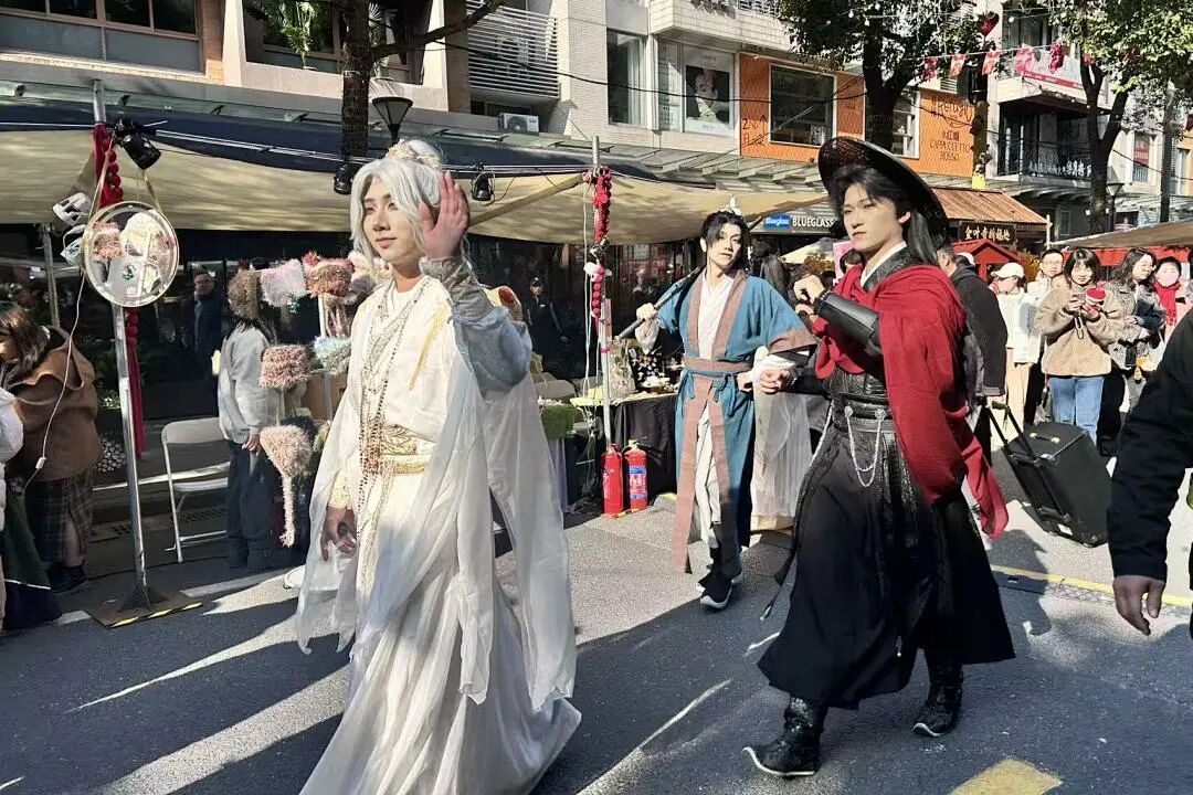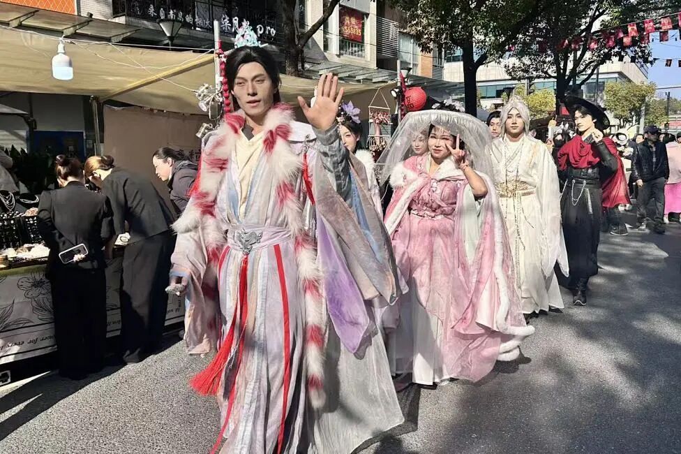 大年初二的下午,冬日暖阳下的大学路人潮涌动。一支身着锦衣华服的队伍从创智天地路口缓缓走来。几位年轻的“侠客”手持宝剑、身披斗篷,面戴轻纱,向道路两旁的市民作揖拜年。这不是古装剧的拍摄现场,而是杨浦区大学路限时步行街“水龙吟”新春市集的古风巡游时刻。