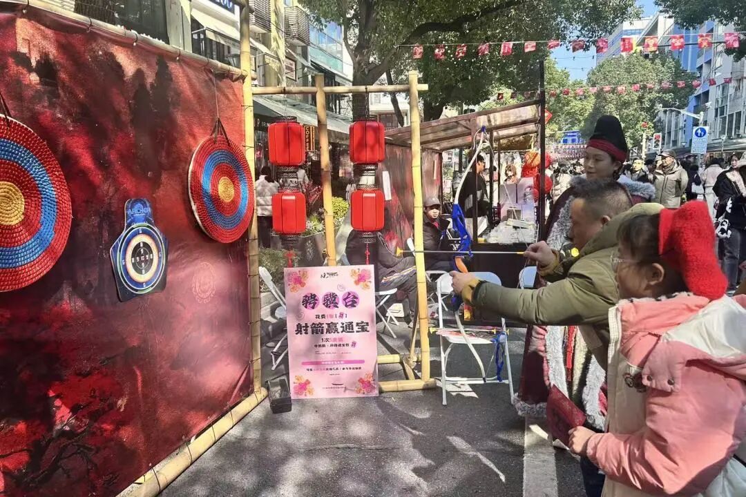 “以前逛集市是‘买买买’,现在是‘玩玩玩’。”家住五角场的“00后”大学生小陈手里攥着几张仿古的“纳福通宝”纸币,正兴奋地在“聘骥台”前排队体验投壶游戏。