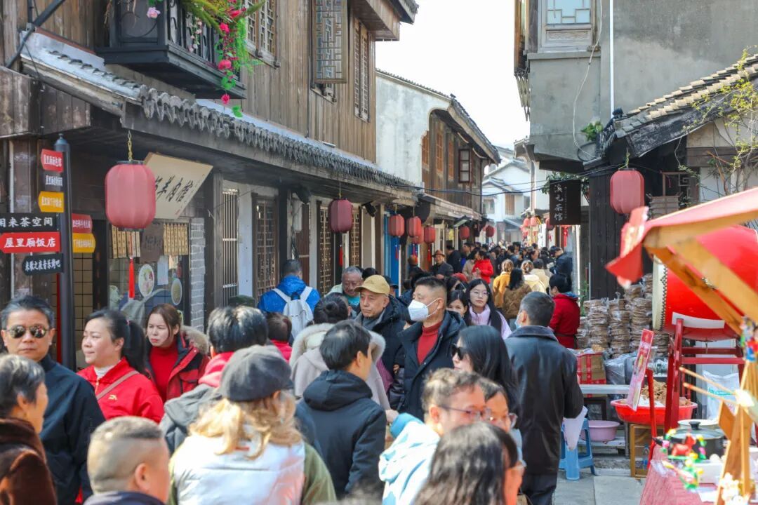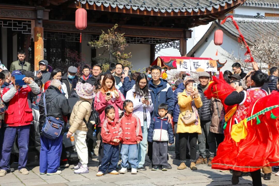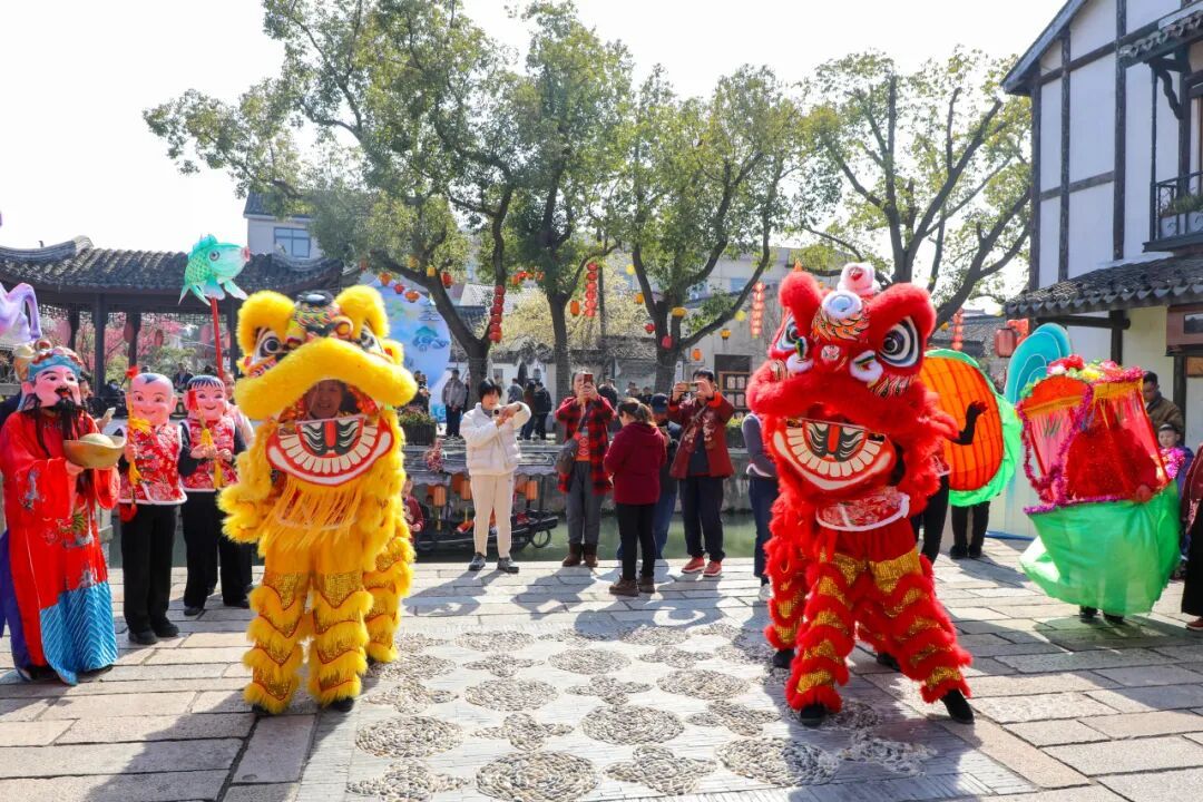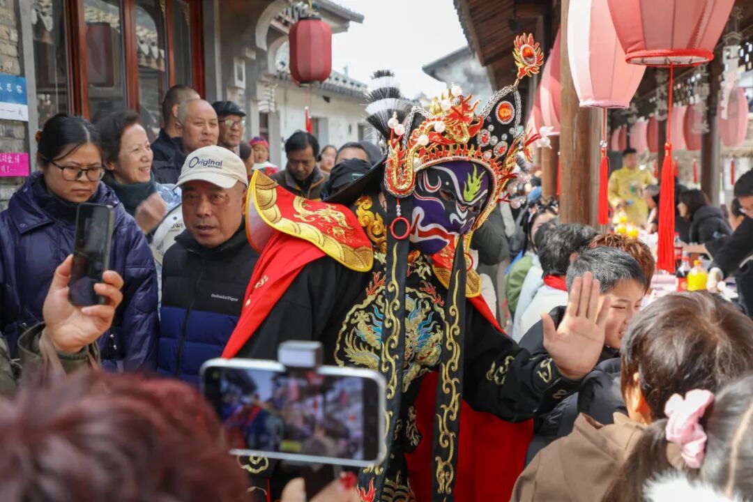 整个春节假期,老街精彩不停:热闹的民俗巡游穿街而过,舞龙舞狮轮番登场;“唱响新春”音乐会在老戏台开唱,民谣戏曲交织;互动区特设“诗词迷宫”,游客可猜灯谜、对诗句;“马上有福”非遗集市汇集手作好物,一旁的非遗工坊开放拓印制作、糖画、扭扭棒等体验。待到夜幕降临,马年灯会璀璨亮灯,造型各异的彩灯沿河铺展,重现“小桥流水人家”的诗画意境。