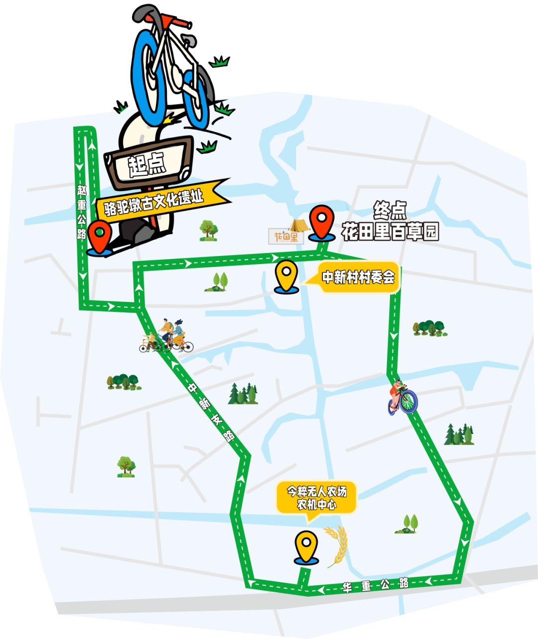 乡村骑车 真的好美啊! 新春寻古溯源(骆驼墩古文化遗址)→田园纳福探春(今粹智慧农场)→乡村休憩补给(中新村委会)→药香康养收尾(百草园),沉浸式感受乡村新春静谧与生机,兼顾文化体验与休闲放松。 路线总长:约8–10公里(环线/往返均可) 路况:乡村柏油路+田间绿道,平缓无陡坡,休闲友好 最佳时段:新春假期全天(9:00-16:00最佳,光线柔和、气温适宜),避开雨雪天气 路线01: 起点:骆驼墩古文化遗址→今粹智慧农场(约3公里,20分钟) ✨骑行路径:从骆驼墩古文化遗址出发,沿赵重公路辅道向南骑行,转入中新乡村道向东,穿行千亩高标准农田,直达中新村820号·今粹无人农场农机中心。 ✨点位打卡:骆驼墩古文化遗址(青浦区文保单位),椭圆形土墩承载千年文脉,新春时节骑行其间,可感受古今时光交融的静谧之美。遗址为西周至西汉重要文化遗存,曾出土硬陶、原始瓷、铜镜等文物,立有详细碑刻介绍,适合新春寻古研学。 ✨停留建议:出发前在遗址停留15–20分钟,观遗址碑刻、远眺土墩,感受千年历史肌理后再开启骑行。 路线02: 今粹智慧农场→中新村村委会(约2–3公里,15分钟) ✨骑行路径:从智慧农场农机中心出发,沿农场外围生态绿道向西,经中新村宅间水系、景观林带,抵达中新村村委会。 ✨点位打卡:今粹智慧农场约1000亩,新春时节的田园虽少了稻浪翻滚,却有静谧的田埂与清新的空气,适合远眺休憩、感受自然生机;农场配套的富硒稻科技小院可了解农业科普知识,增添新春出行的趣味性。中新村村委会周边配套便利店,新春期间正常营业,可在此休憩补给、选购本地新春特产。 ✨停留建议:农场停留20–30分钟观无人农机、看稻田科技展牌;村委会停留10分钟补给休整,为后续行程蓄力。 路线03: 中新村村委会→花田里·百草园(约0.4公里,3分钟) ✨骑行路径:从中新村村委会出发,沿华重公路骑行68米,转入中新支路骑行77米,再直行218米即可抵达花田里·百草园园区入口。 ✨点位打卡:花田里·百草园(约350亩),新春时节的百草园虽无药花盛放,却有错落的林下景观与整洁的彩虹步道,红橙相间的步道与白墙黛瓦的乡村建筑相映,充满新春喜庆氛围。 ✨停留建议:30–40分钟,漫步药香步道、打卡彩虹路,体验中医药文化氛围,结束本次骑行旅程。 路线参数与装备建议 ❕总里程:约5.4–6.4公里,骑行+游览全程2–3小时 ❕难度:★☆☆☆☆(全平路,新手/亲子/休闲骑均可) ❕必备装备:新春骑行建议携带保暖手套、围巾、保温杯(装热水);防晒帽、冰袖可根据当日气温灵活准备;备用内胎、简易补胎工具 ❕补给点:中新村村委会便利店、农场周边农家小店(可购水、简餐、本地农产品) 打卡与体验Tips 1.遗址寻古:骆驼墩为文保单位,新春观览需不攀爬土墩、不擅自挖掘,文明感受千年文脉。 2.新春拍照:百草园彩虹步道(喜庆出片)、今粹农场田埂(田园清新风)、中新村民居水系(乡村年味),都是新春打卡好点位,建议穿亮色衣物拍照更出片。 3.季节亮点:新春时节乡村静谧清新,游客较少,可沉浸式享受骑行乐趣;部分农户会张贴春联、挂红灯笼,沿途可感受浓厚的乡村年味。 4.延伸玩法:新春期间可衔接重固福泉山遗址(寻古祈福)、章堰古村(感受古村年味),延长至15公里全域新春骑行线,体验更丰富。 记者:朱云霞 制图:融媒体重固镇分中心 编辑:李璨(名优) 责任编辑:孙晨(首席) 转载请注明来自“绿色青浦”官方微信