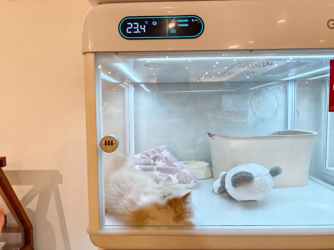 记者在现场看到,门店为宠物准备了多种不同规格的“房型”,涵盖0.6㎡基础柜体、太空舱以及VIP间等,价格从200元至600元不等,可满足不同养宠人的需求。陈先生介绍,选择太空舱的市民不在少数,它的空间不算大,但这种舱体有恒温、消毒和新风系统,确保了宠物的健康。同时,舱内还有监控系统,可以让“家长”随时查看自家“毛孩子”的状态,缓解思念之情。