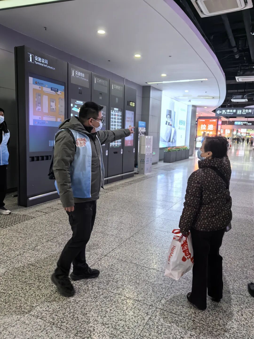 区科创服务中心负责人许施航已经连续五年担任春运志愿者,是虹桥火车站的“活地图”,他马上安抚旅客情绪,凭借丰富经验,迅速确定位置并提供了方向指引。