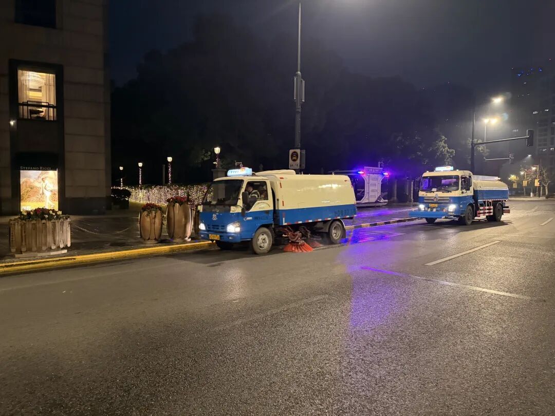 清晨天微亮,当街头还未迎来客流高峰,新能源高压冲洗车、扫路车便已集结出发,对主次干道进行深度冲洗,高压水流冲去路面的油污与灰尘,扫路车紧随其后完成全覆盖保洁,让百年老街恢复清爽本色;夜间游客散去,机械化作业再次上阵,为第二天的热闹做好准备。