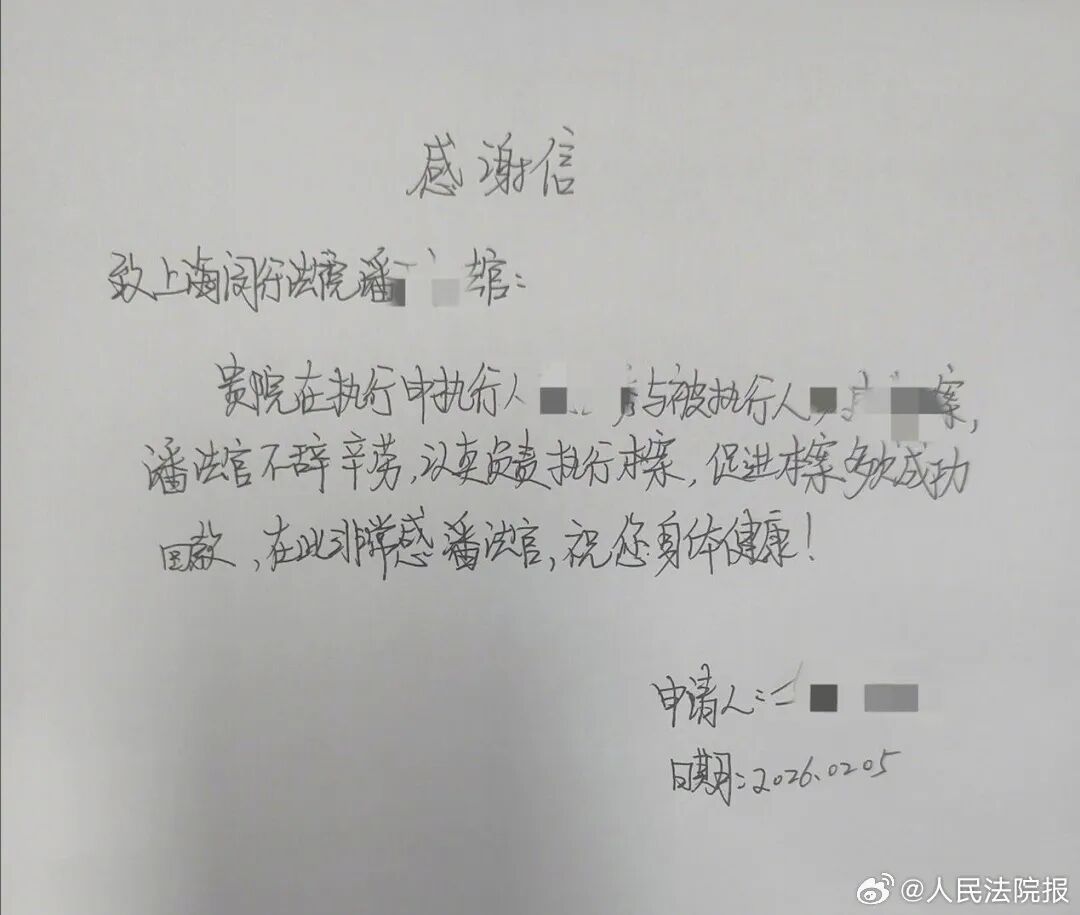 年关将近,赵女士再次拿回20余万元真金白银,感激之情溢于言表。而当她偶然得知,这位为她奔波已久的法官即将退休时,更是露出了深深的不舍:“潘法官,您这……真是帮我们到底了。”并且当场书写感谢信,对潘法官表示感谢。
