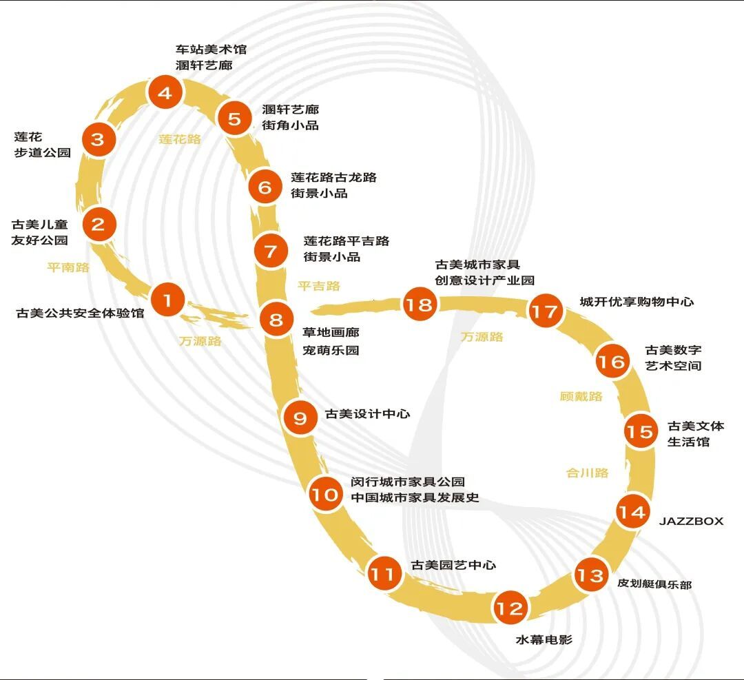 佳作映街区 午马迎新年 午马迎新 马年大吉 新春年味正浓! 这个春节,不妨带上家人朋友, 来一场充满设计与年味的 城市家具主题CityWalk! 漫步在红火喜庆的氛围中, 感受艺术与传统的交融碰撞! 路线亮点抢先看 路 线 概 况 路线呈现莫比乌斯环形,整合古美内18个特色空间节点与3条绿色步道资源,总长3.2公里。以万源路上的古美公共安全体验馆为叙事起点,最终在古美城市家具创意设计产业园区画上句号。 美 学 生 活 闵行不仅拥有现代化的城市风貌,更在公共空间中融入了浓浓的人情味与艺术感。让你在漫步中不仅能欣赏设计之美,还能捕捉到浓浓的年节气息。“一角一景、一步一趣”的城市家具应用场景,让城市美学真正融入市民日常生活。 更值得一提的是,多处打卡点都设置了春节主题的互动装置与拍照背景,让你轻松拍出充满年味的“九宫格”,在朋友圈里传递喜庆与创意! 不能错过的打卡点 每个打卡点上都有这样的路标, 帮你认准方向,不迷路↓ 01 古美公共安全体验馆 兼具科普趣味性的公共空间,使市民在体验中学习安全知识与自救技能。 02 古美儿童友好公园 引入星际探索和中国航天等太空主题,激发儿童对宇宙的好奇及对科学探索的持久热情。 03 莲花步道公园 一座融合绿道、健身步道、风雨亭、四季花卉与城市家具的绿色生态空间。 04 车站美术馆溷轩艺廊 多功能的综合空间,融入诸多创新元素和人文关怀,让市民与艺术之美不期而遇。 05 溷轩艺廊转角街角小品 艺术雕塑以字母“GUMEI”(古美)为原型进行艺术创作,结合现代波普艺术元素。 06 莲花路古龙路街景小品 融合蝴蝶起飞的形态,通过艺术雕塑的设置,打造兼具艺术展示与科普功能的街头空间。 07 莲花路平吉路街景小品 聚焦数学美学和童真浪漫,将斐波那契数列、黄金比例等数学原理转化为可体验的景观语言,实现理性与浪漫的碰撞。 08 草地画廊萌宠乐园 一个持续更新的艺术展示平台,陈列着第一届“古美杯”闵行区城市家具设计创意大赛的获奖作品,并升级为宠物友好的萌宠乐园。 09 古美设计中心 一个集创意、设计、文化交流与公共服务于一体的综合性设计创新平台。 10 闵行城市家具公园 (中国城市家具发展史文化长廊) 两届“古美杯”闵行区城市家具创意设计大赛中的100余件作品陆续在公园内落地。“走过五十米,阅读五千年”中国城市家具发展史文化长廊以图、文、物、音并茂的形式讲述中国古代城市家具故事。 11 古美园艺中心 公园内部,一处人与自然和谐的宜居生态公共区域,后续可以提供园艺交流等公共服务。 12 水幕电影 水流与激光共舞,音乐与影像交织,呈现出一场场超乎想象的视听盛宴。 13 皮划艇俱乐部 位于公园蝶湖旁,可以体验皮划艇、桨板等水上运动项目,同时也能享受到咖啡和美景。 14 JAZZBOX 以集装箱为载体,融合爵士乐元素,将工业风与爵士的自由随性结合的独特音乐空间。 15 古美文体生活馆 将剪纸文化的特点和文化元素延伸到建筑立意、建筑形体和建筑立面等方面,运用现代设计手法,演绎新时代的社区文化建筑。 16 古美数字艺术空间 利用碎片空间“公园围墙外绿地”和碎片时间“等待公交的间隙”,形成一场城市空间的艺术展览。 17 城开优享购物中心 面向周边白领和社区居民的“小而美”精品商务配套中心。 18 古美城市家具创意设计产业园 简称“一号具谷”,聚焦城市家具、创意设计、时尚创意等文创设计新兴产业,地理位置优越、生态环境优美、公共服务设施完善。 这个春节,不必远行,就在闵行, 用一场充满艺术与年味的CityWalk, 开启一个红红火火、热热闹闹的新年! 漫步3.2公里,看遍400多件作品, 拍下属于你的“马上有福”九宫格, 让设计点亮生活, 让年味温暖你我。