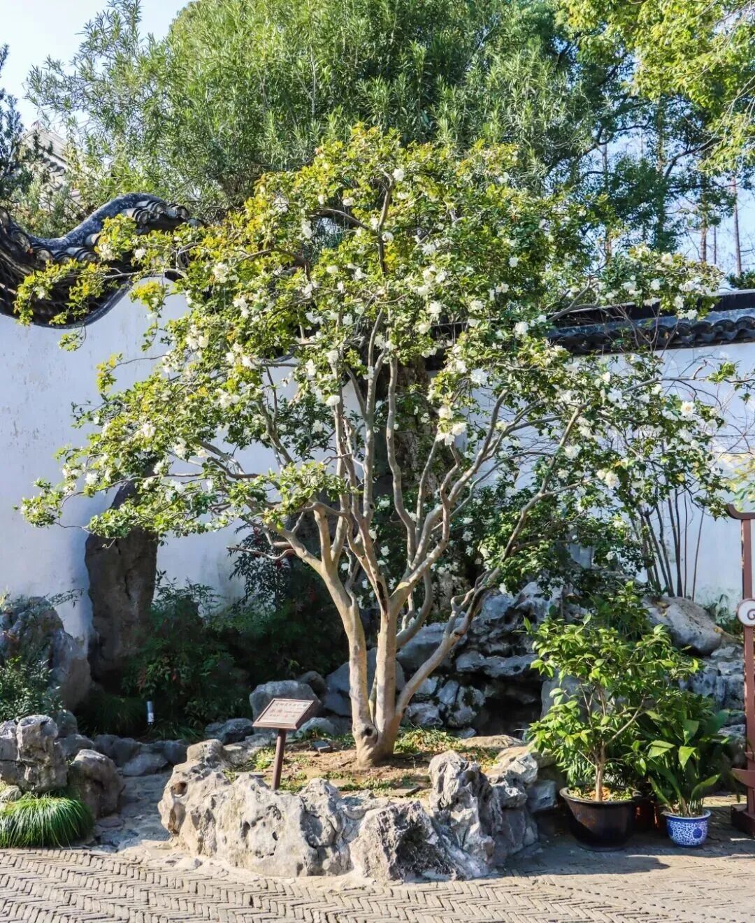 根据《茶梅》(徐碧玉著)记载,这株古茶梅移植时树高已达4米,冠径超过4米,主干基部周长63厘米,其独特的树形展现出岁月雕琢的自然韵味。经过豫园园林专家的精心养护,这株百年古树如今枝繁叶茂,每年冬季都会如期绽放纯白色的重瓣花朵,在古典园林中散发着淡雅清香,为游人带来冬日的惊喜。