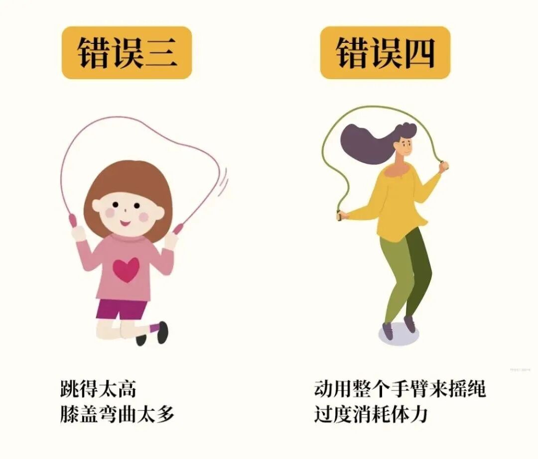 ☑手臂发力甩绳效率低且易酸痛,应靠手腕发力,手臂贴近身体、肘部微屈;