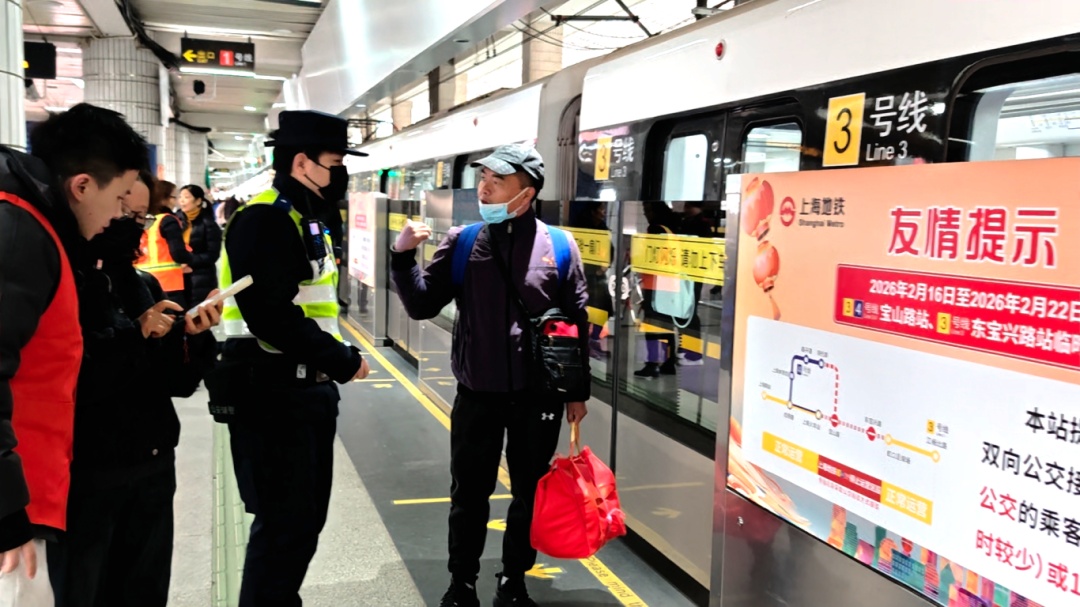 轨道公交分局上海火车站站治安派出所民警周慕泽:“3、4号线宝山路站停运施工,对春运客流产生了一定影响,对此我们积极对接运营部门和属地公安,在施工期间将持续互通施工进度,强化宣传告知,做好公交短驳点秩序维护,确保乘客出行安全。”