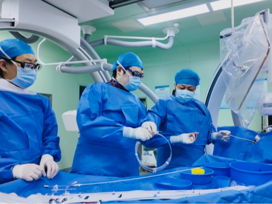 大年初三上午,在同济大学附属上海市第四人民医院DSA导管室内,血管病科执行主任裴轶飞正在进行一台急诊介入手术。