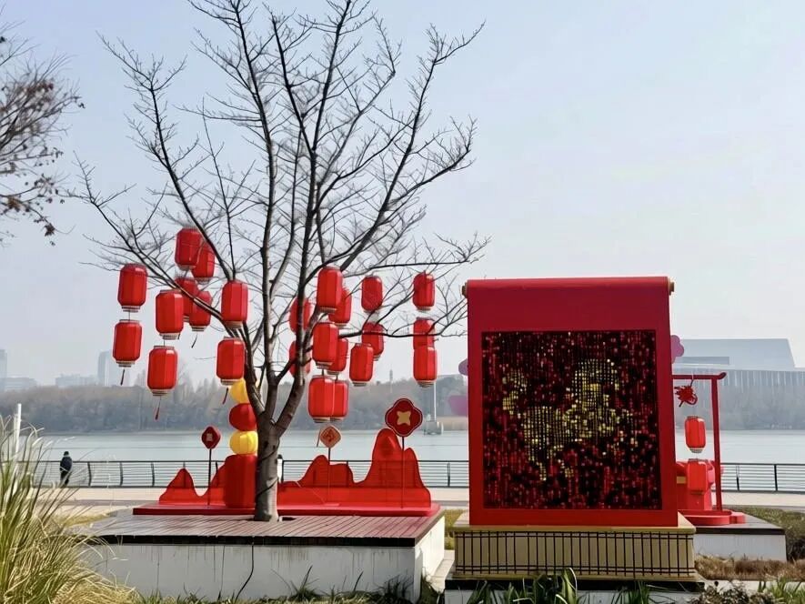 江风拂面,年味满城。在亲水平台旁的绿化景观带中,一座巨型红色艺术装置格外醒目,装置表面由红、黄两色亮片拼接成奔腾骏马的轮廓,微风拂过,亮片摇曳,骏马造型灵动鲜活,与马年新春主题完美呼应。装置旁的香樟树上,一串串红灯笼错落悬挂,红绸点缀其间,与湛蓝的天空、波光粼粼的江面构成一幅喜庆的水岸年画。阖家出游的市民纷纷驻足,或在装置前合影留念。