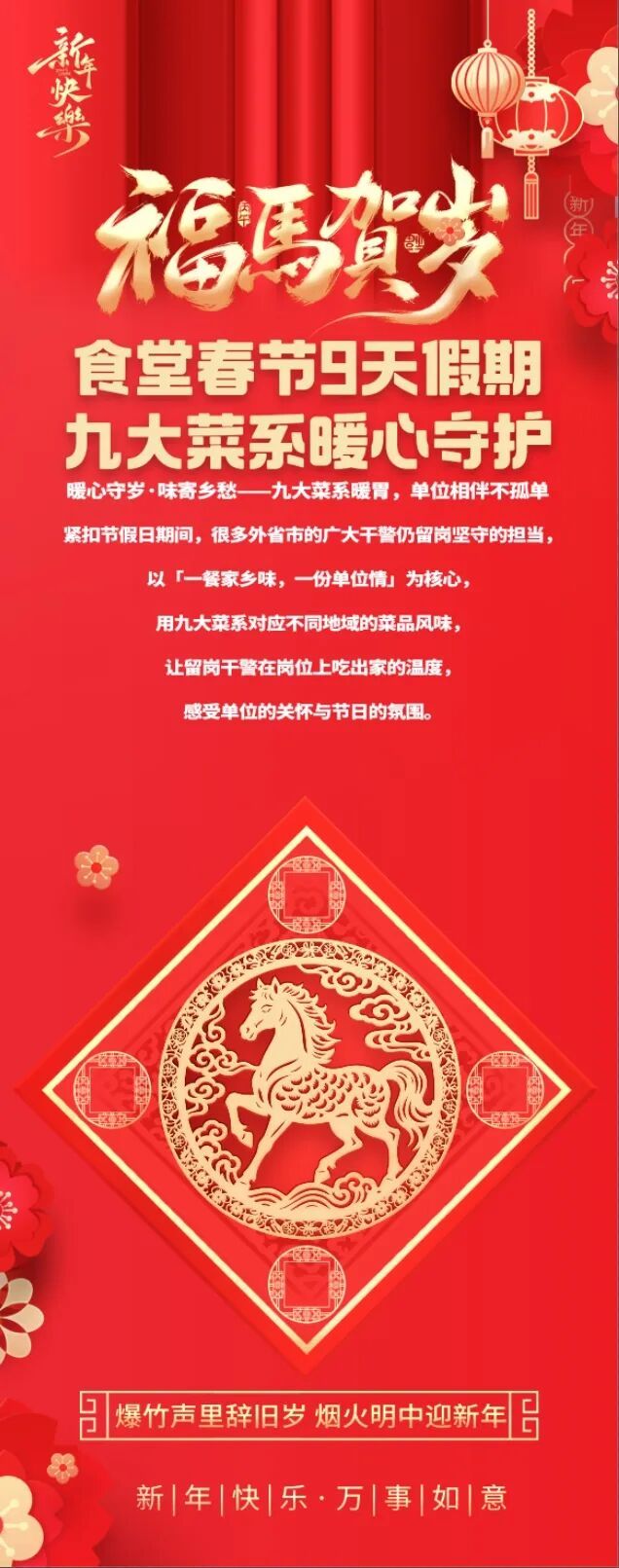 从除夕的鲁菜,到初八的上海本帮菜,每天一个地域主题,两道家乡荤味,搭配一份地域主食与汤品,让来自五湖四海的值班民警,在节日期间的执勤岗位上也能吃上那口“家乡的味道”,以实际行动践行“后勤保障暖警心”的服务理念。
