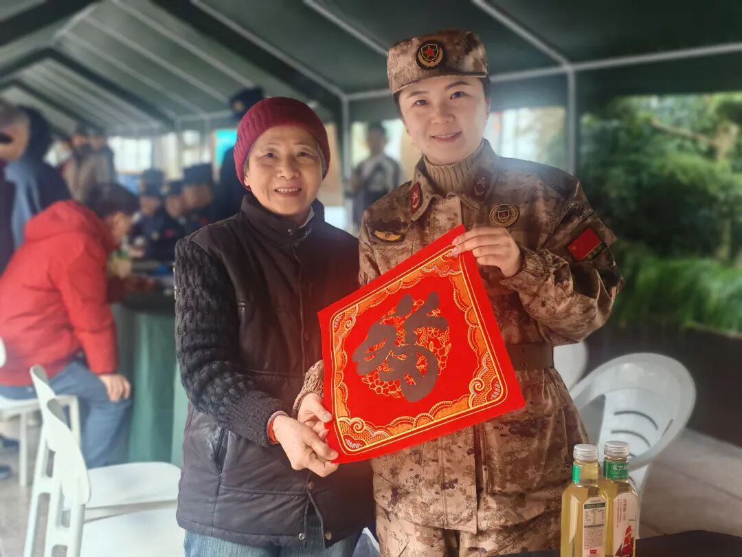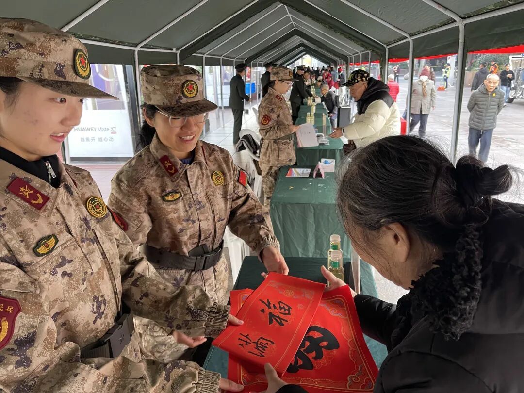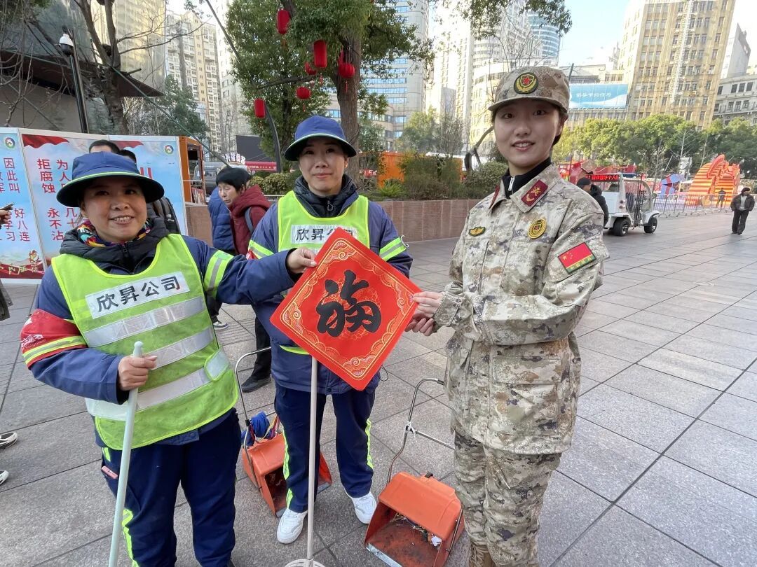 现场最暖心的一幕,当数女子民兵连的队员们捧着大红福字,快步走到“南京路上好八连”的服务桌前。“八连的老班长们,给您拜年啦!”随着一声清脆的祝福,队员们将福字递到好八连队员手中,两个单位的队员们随即并肩而立,手举福字共同合影,鲜红的福字映着一张张笑脸,成了南京路步行街上最动人的新春风景。