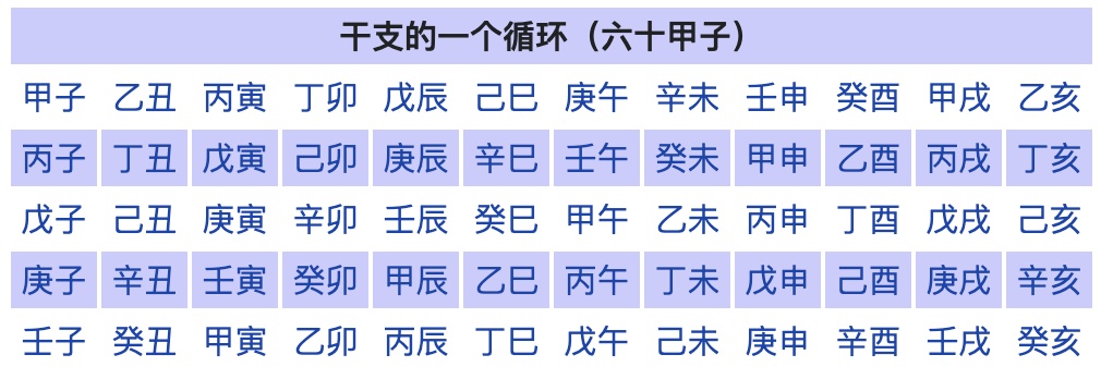 干支纪年是以十个天干——甲乙丙丁戊己庚辛壬癸,和十二个地支——子丑寅卯辰巳午未申酉戌亥,双排结合往下数,第一年是甲子,第二年是乙丑,以此类推,60年即一循环。