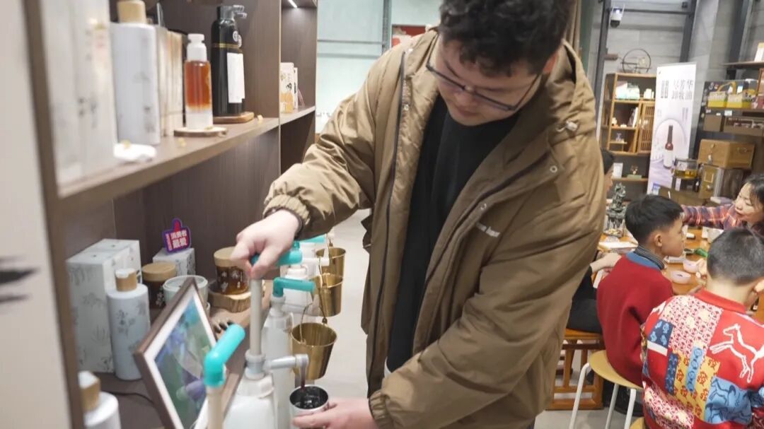 除了便捷实惠的“零拷”服务,生活馆内的手工体验课程也吸引了大批顾客。在澡豆体验现场,客人们按照古法配比,将白僵蚕、细辛、黑丑等药材研磨成细粉,再与枣花蜜充分揉合、搓制成丸,全程约一小时,便可带走这份专属的“千年洁面礼”。