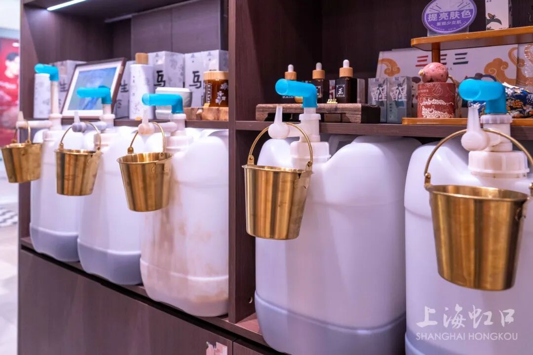 更富巧思的是,部分由古方熬制的洗发水、润发素,以及中草药制成的凝露、精华水、护手霜等单品,都被盛放于食品级容器中。在此,顾客可沉浸式体验老上海“零拷”购物的乐趣,自带瓶罐,按需取用。