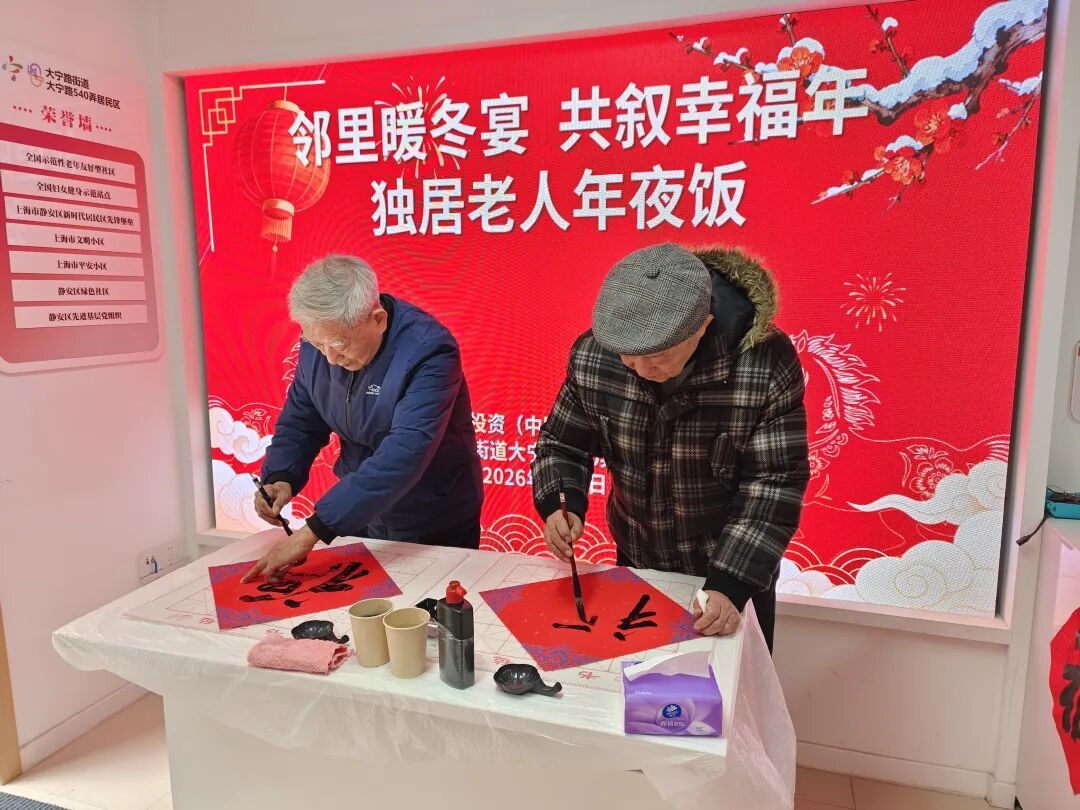 餐桌旁,退休老党员凝神运笔,挥毫写下一张张红底墨字的“福”字,墨香袅袅,祝福满满。每位老人都领到了手写“福”字和新春福袋,捧着“福”字的王阿婆笑意满面:“每年都能吃到这样暖心的年夜饭,谢谢居委年年记挂着我们。”