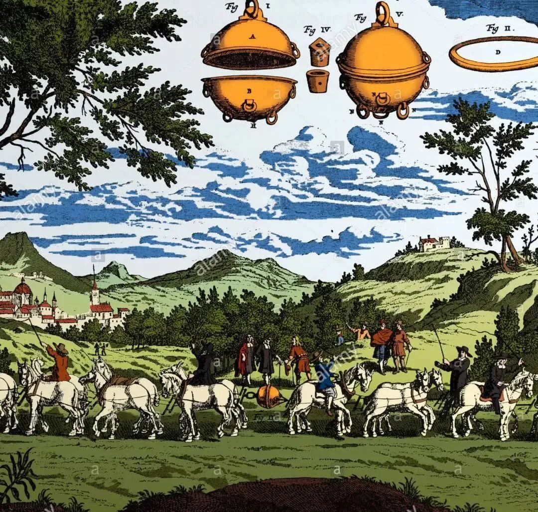 他将两个直径约37厘米的铜质半球紧密贴合,抽走内部空气后,在半球两侧各拴上8匹马,让它们向相反方向拉拽。结果16匹马拼尽全力,才将两个半球拉开。这个实验直观地证明了大气压强的存在,也让人们第一次真切感受到,我们身边的空气竟有如此大的力量。
