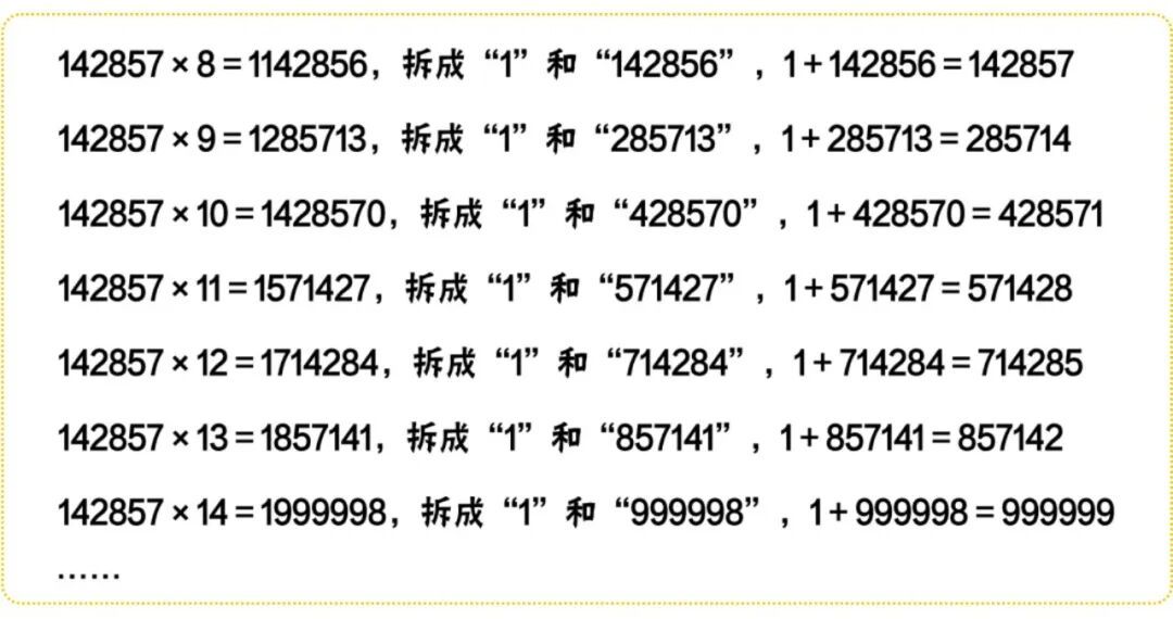 另外你知道吗?自然数中有一个特殊的数字叫作“走马灯数”——142857。它最显著特性是与1至6相乘时,乘积均为原数字的循环排列组合——
