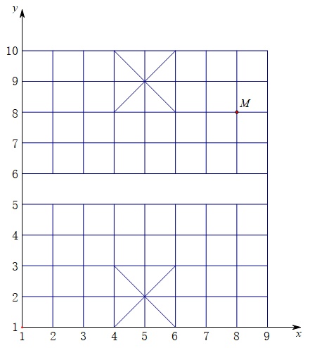 这个坐标系的原点并不是(0,0),而是(1,1),我们将每一个格点位置用两个数字来表示,例如左下角第一个格点表示为(1,1),而“马”所在的格点表示为(8,8),然后我们来研究“马”(M点)跳1步后可能到达的位置,如下图: