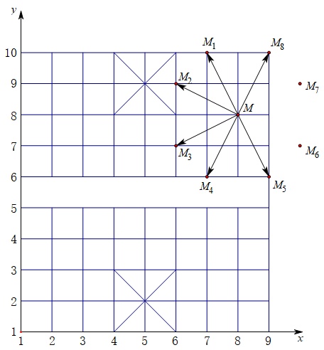 按照中国象棋规则,点M可抵达M1,M2,……,M8共8处,但受棋盘限制,有两个点无法抵达,只剩下6处,我们分别观察这6处点的坐标,发现它们相对点M(8,8),横纵坐标均发生了变化,分别为(7,10),(6,9),(6,7),(7,6),(9,6),(9,10),依次改写为(8-1,8+2),(8-2,8+1),(8-2,8-1),(8-1,8-2),(8+1,8-2),(8+1,8+2),发现跳1步之后,点M可能到达的位置坐标为(8±1,8±2)或(8±2,8±1);