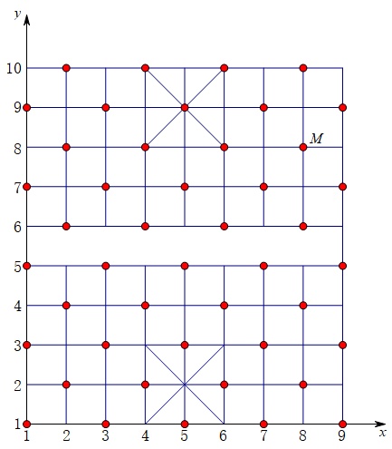 中国象棋的棋盘总共有8×9个方格,格点总共90个,而棋子“马”从最初位置开始跳,20步内可以到达任何一处格点,但题目求第20步棋子“马”可能到达的格点,就涉及每一步“马”应该如何跳,按中国象棋规则,“马”走日,为方便叙述,我们建立平面直角坐标系,如下图:
