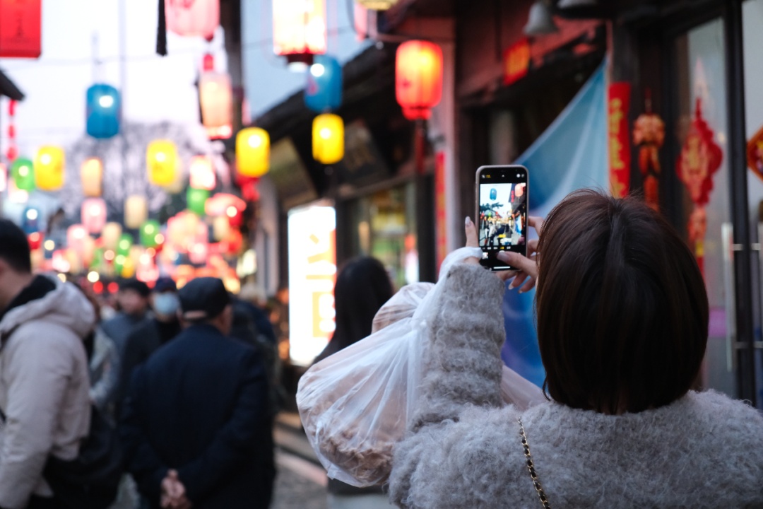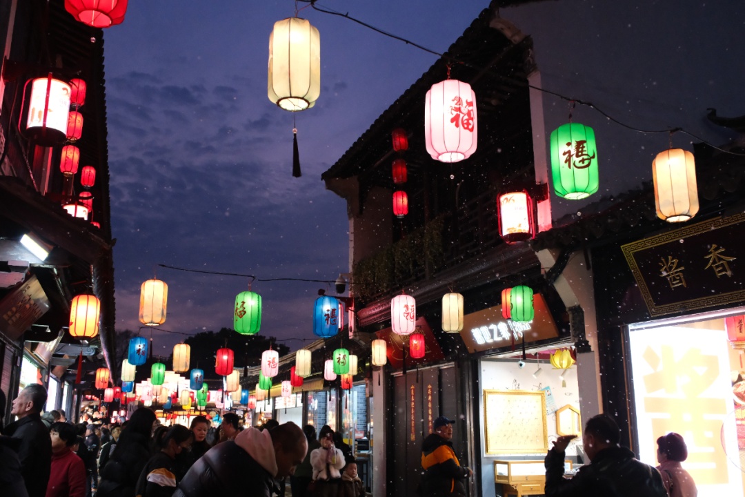 “我们很喜欢这里,所有的店铺都很有趣,尤其是那些小吃店,东西很好吃,大家也很友好!”来自加拿大的游客KT和朋友漫步在飘雪的街巷中表示,五彩斑斓的灯光映照着古镇市集,熙熙攘攘的人群中不时传来欢声笑语,让她感受到浓郁的新春氛围。