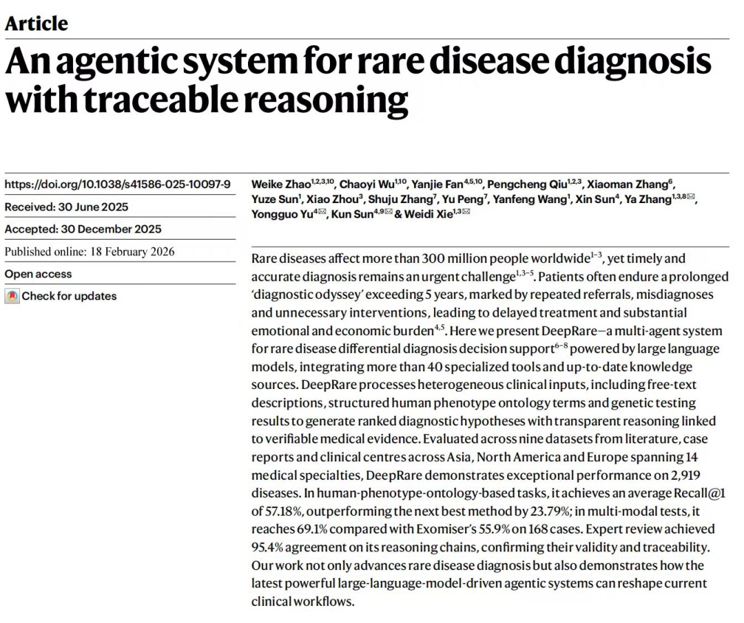 由上海交通大学医学院附属新华医院孙锟教授、余永国教授与上海交通大学人工智能学院、医学人工智能研究院张娅教授、上海交通大学人工智能学院谢伟迪副教授领衔的联合团队,以临床问题为导向、联合研究为核心、技术落地为支撑,完成了从临床需求到技术突破、再到临床应用的全链条创新,研发出全球首个可溯源智能体式罕见病诊断系统DeepRare,首创“中枢-分身”可溯源Agentic AI架构,让AI诊断从“黑盒”变为“透明诊室”,彻底破解传统医疗AI推理过程不可追溯的“信任危机”。