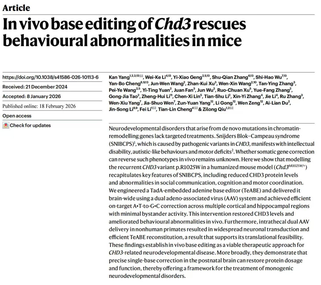 上海交通大学医学院松江研究院仇子龙教授,上海交通大学医学院附属新华医院李斐教授、杨侃副研究员团队联合复旦大学脑科学转化研究院程田林研究员团队和中国科学院分子细胞科学卓越创新中心李劲松院士团队,聚焦由CHD3基因突变导致的Snijders Blok–Campeau综合征(SNIBCPS)这一典型神经发育性疾病,实现了脑内基因位点的精准“修错”,为自闭症等神经发育疾病的基因治疗带来突破性进展。