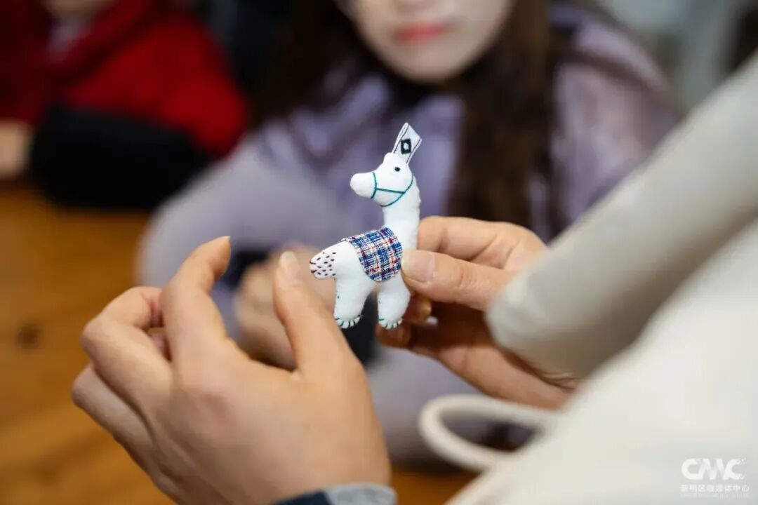 活动正式开始,大家围坐一堂,跟着授课老师填充棉花、裁剪布料、细心缝合……针线穿梭间,憨态可掬的小马渐渐成型。