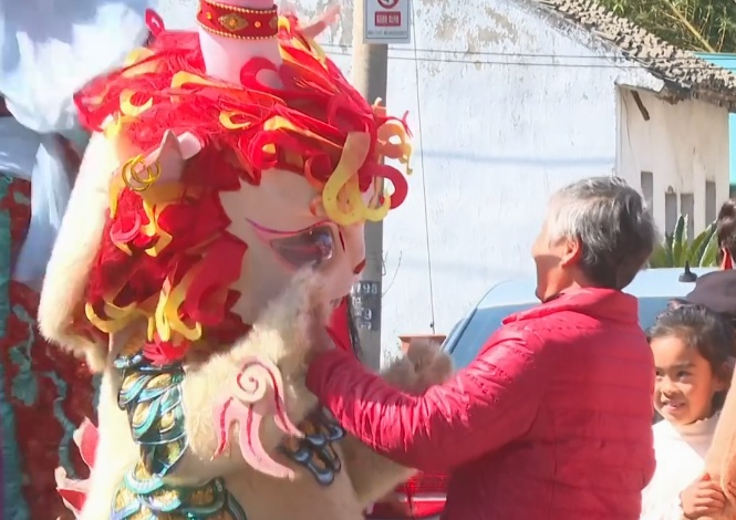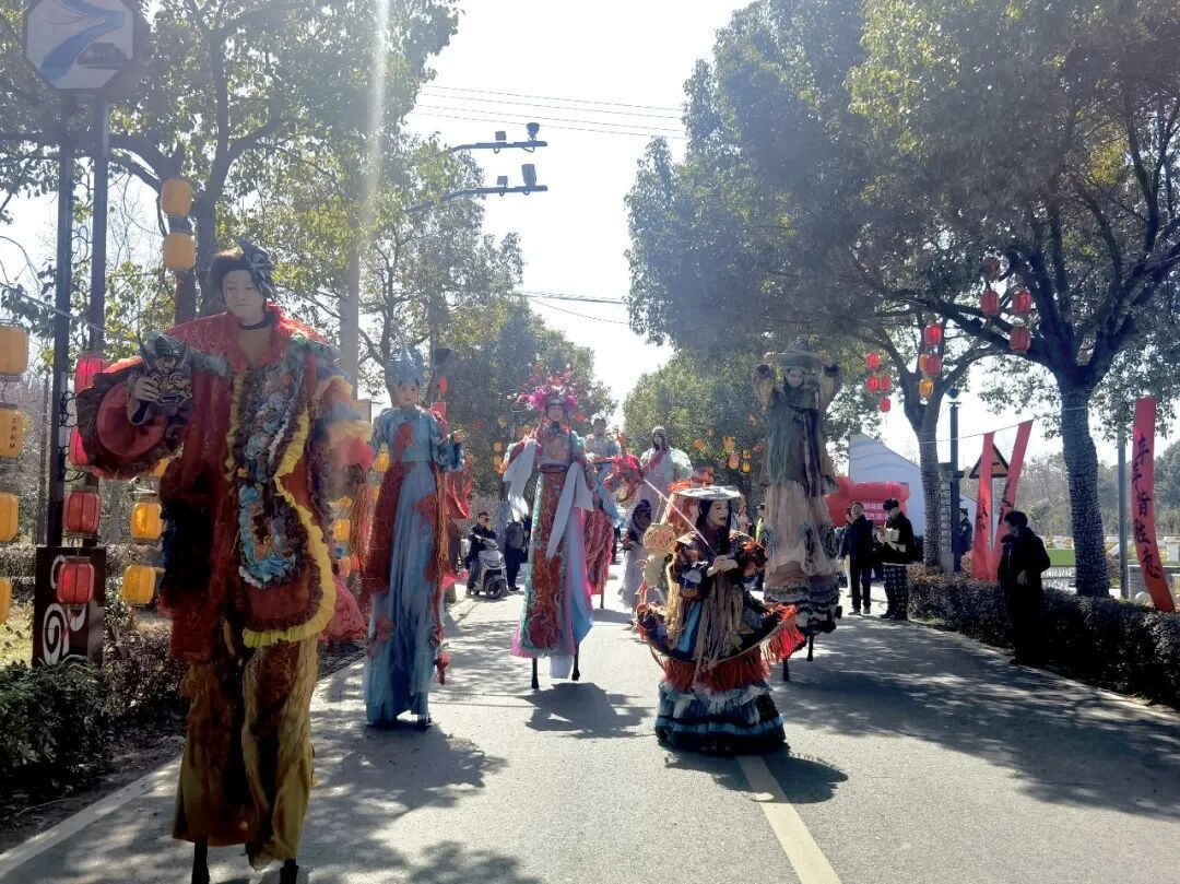 中午12时,在石湖荡镇有米社区,餐厅里已是高朋满座,热闹非凡。不一会儿,今天的主角便闪亮登场。一支表演队在乡间小道上缓缓巡游,迎接财神,演员们身着鲜艳的服饰、踩着高跷,可爱的造型和灵动的舞姿吸引了不少游客驻足围观、拍照纪念。“第一次过来,今天正好也蛮巧,碰到村里组织这样的活动,非常有年味,很赞。”游客任女士感叹。