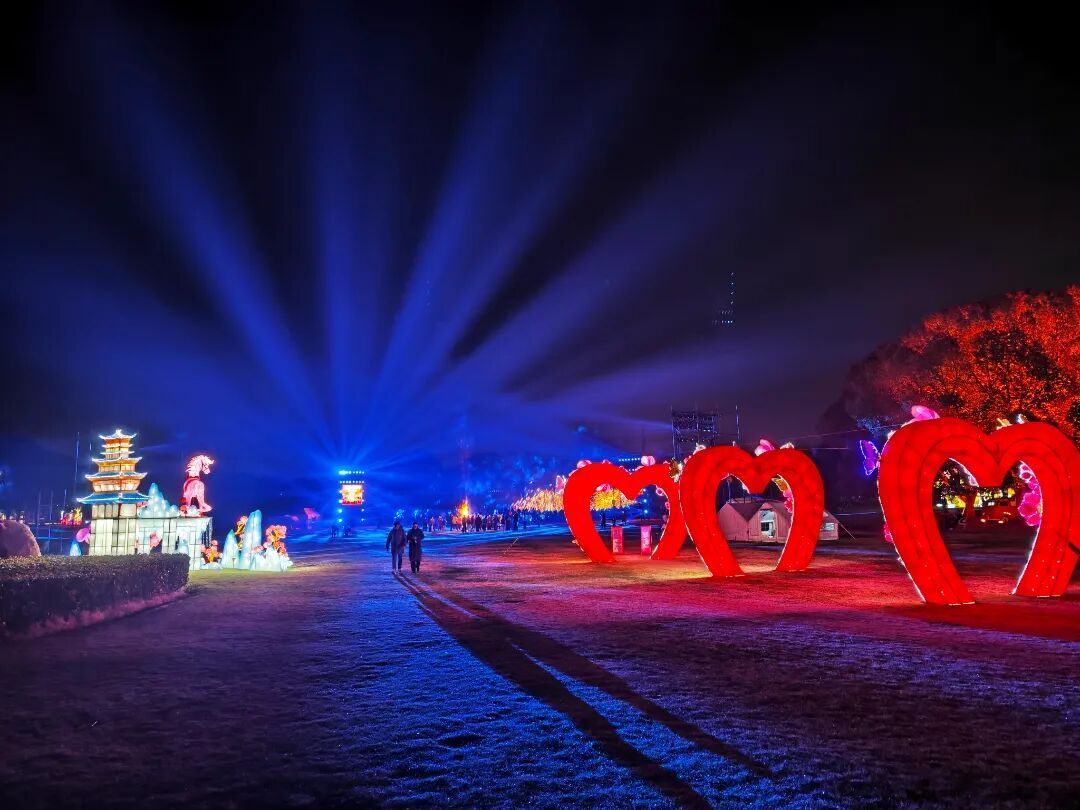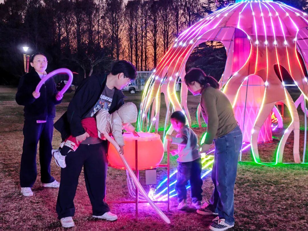 与白昼的雅致梅景不同,夜幕降临后的东方绿舟瞬间切换至“狂欢模式”。园区融合现代灯光与马年元素,精心布置了“灯光隧道”“梅香灯径”等20多组大型主题花灯,将夜晚装点成一片璀璨灯海。