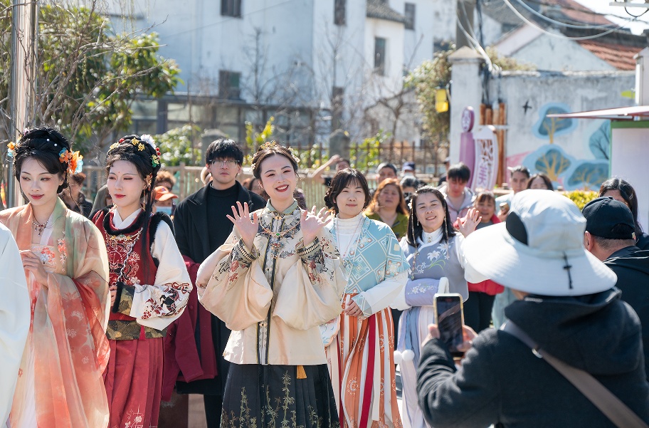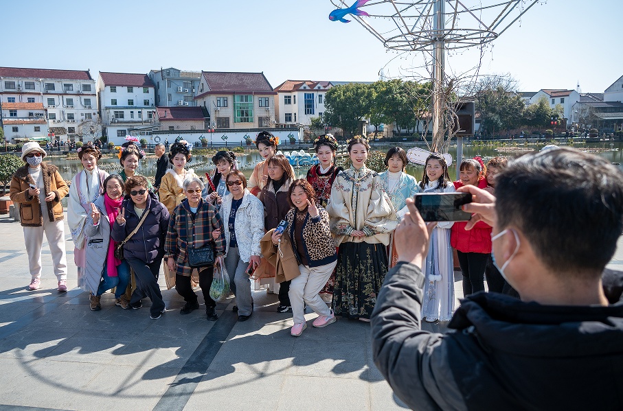 今天(2月21日)下午,身着甲胄、汉服的演职人员身姿挺拔、衣袂翩跹,从逐浪亭有序出发,沿着白墙黛瓦的渔村老街缓缓前行,最终抵达祥鱼湖,引得沿途游客纷纷驻足,拿出手机拍照合影,定格下这一抹亮眼的国风景致。