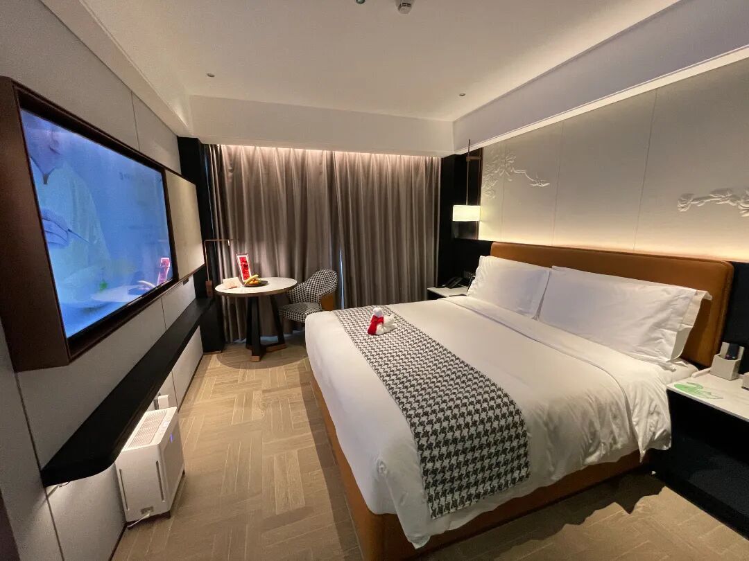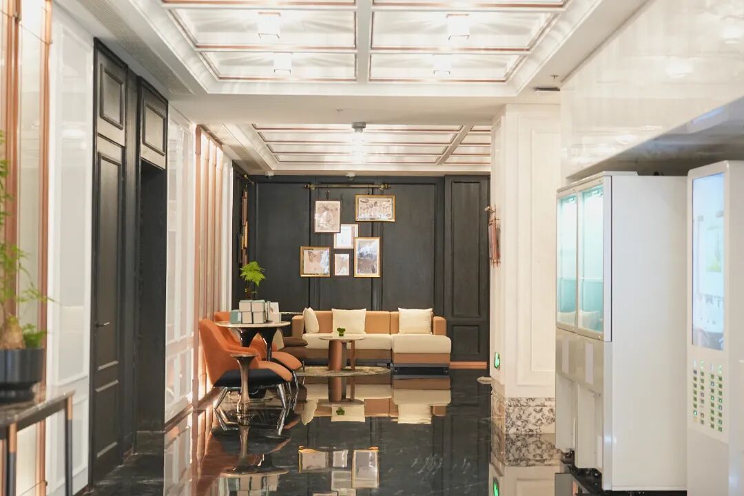 硬件设施上,185间客房全部配备智能客控系统,实现灯光、空调、窗帘“一键掌控”;同时配备送物机器人、自动入住机,整合住中小程序,构建“无接触、零等待”的智能服务闭环,让宾客体验高效便捷的现代旅居服务。