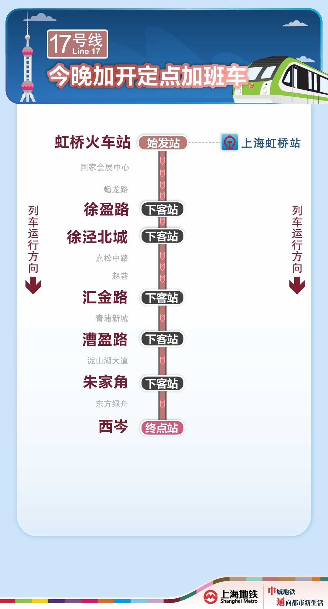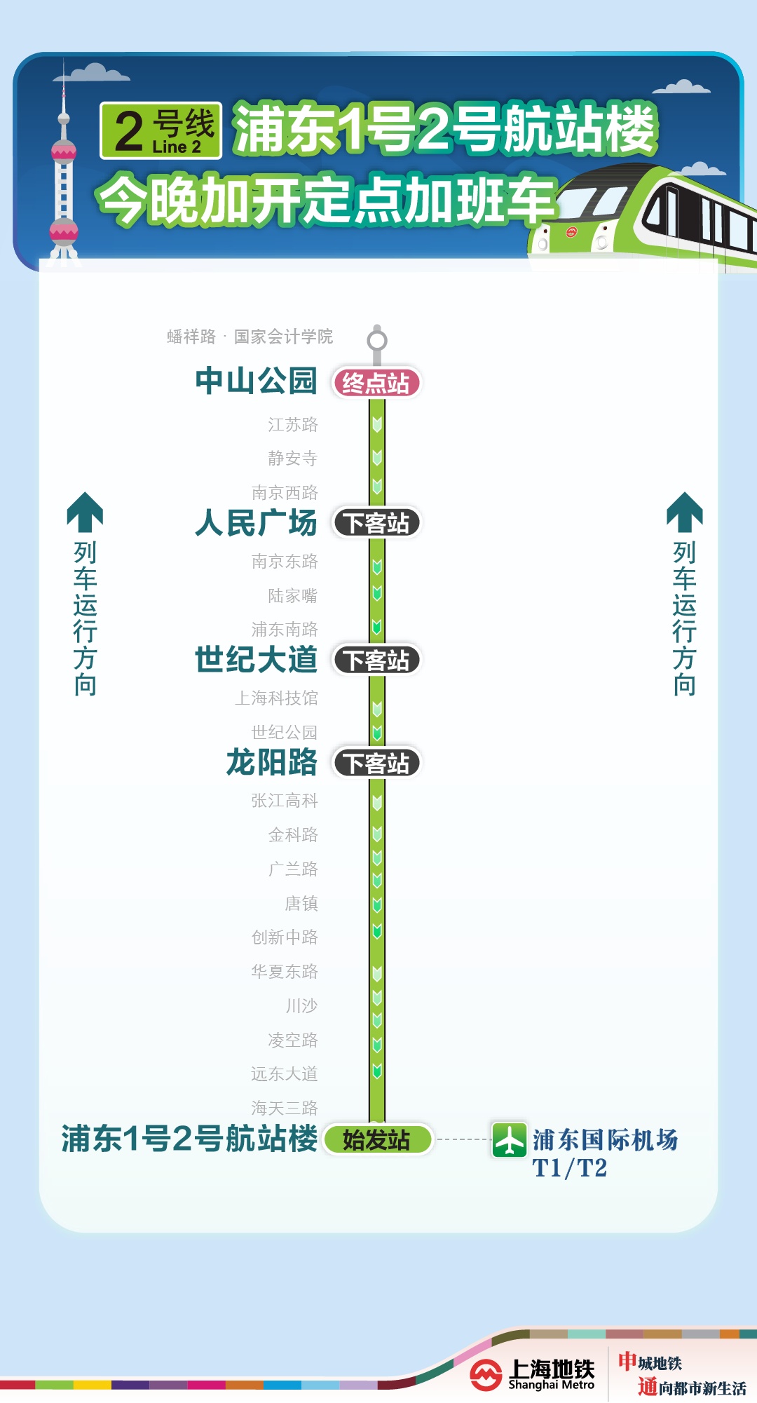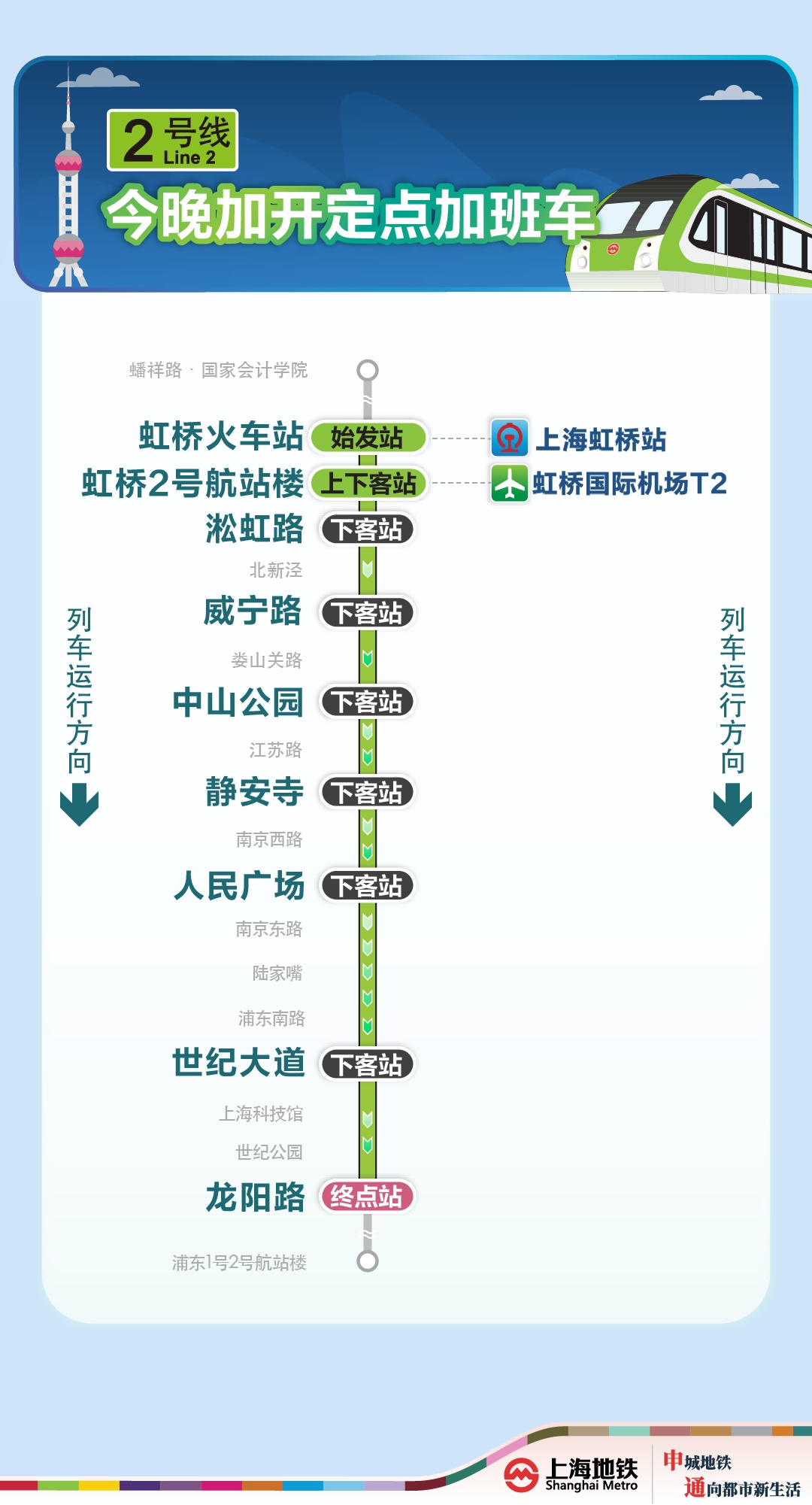 同时,今晚(2月21日)2号线加开定点加班车,浦东1号2号航站楼站往中山公园站加开至23时30分,虹桥火车站站往龙阳路站加开至次日(2月22日)2时30分,17号线加开定点加班车,虹桥火车站站往西岑站加开至次日(2月22日)1时,9号线加开定点加班车,上海松江站站往杨高中路站加开至次日(2月22日)0时。定点加班车只停靠指定站点。