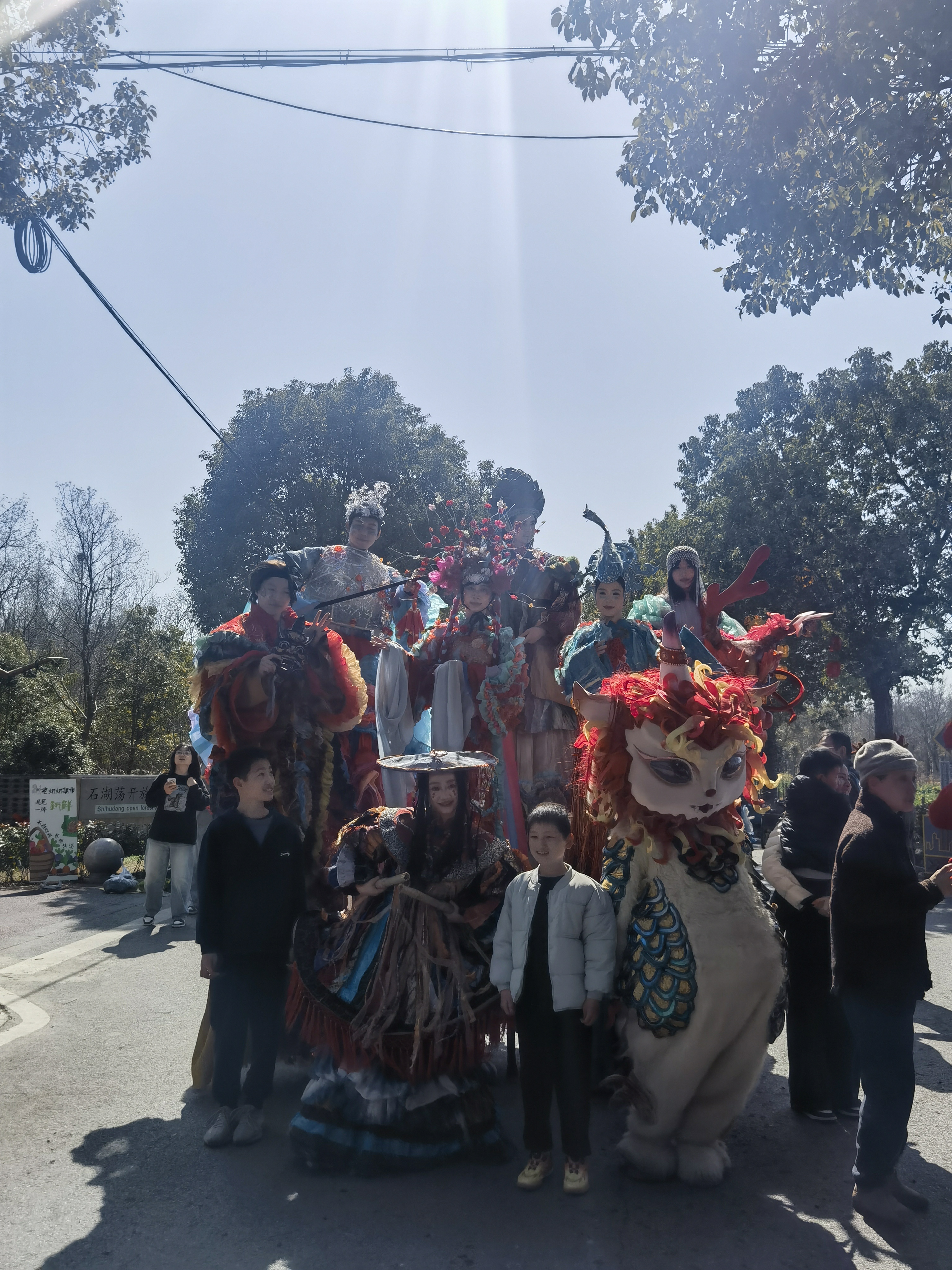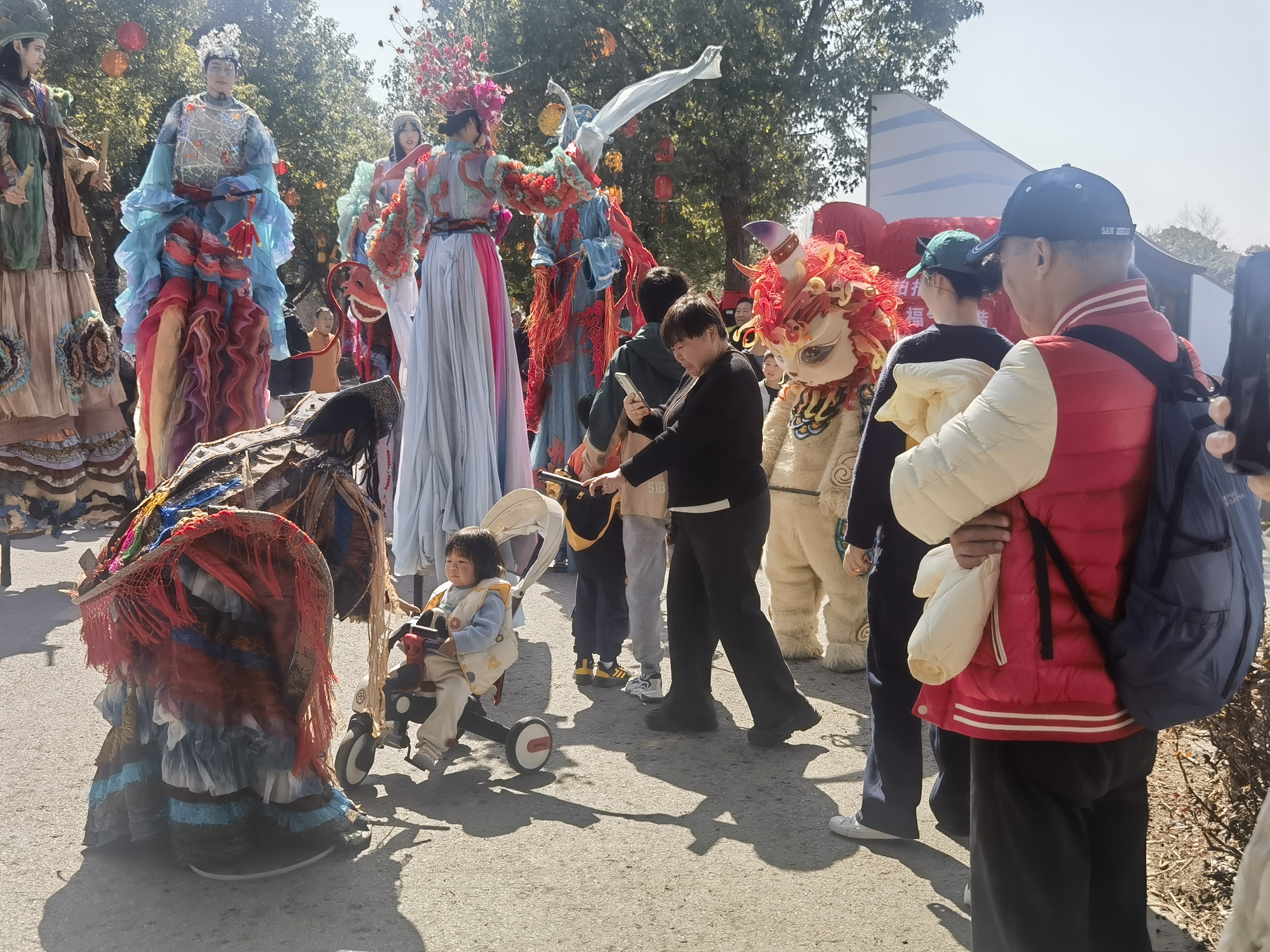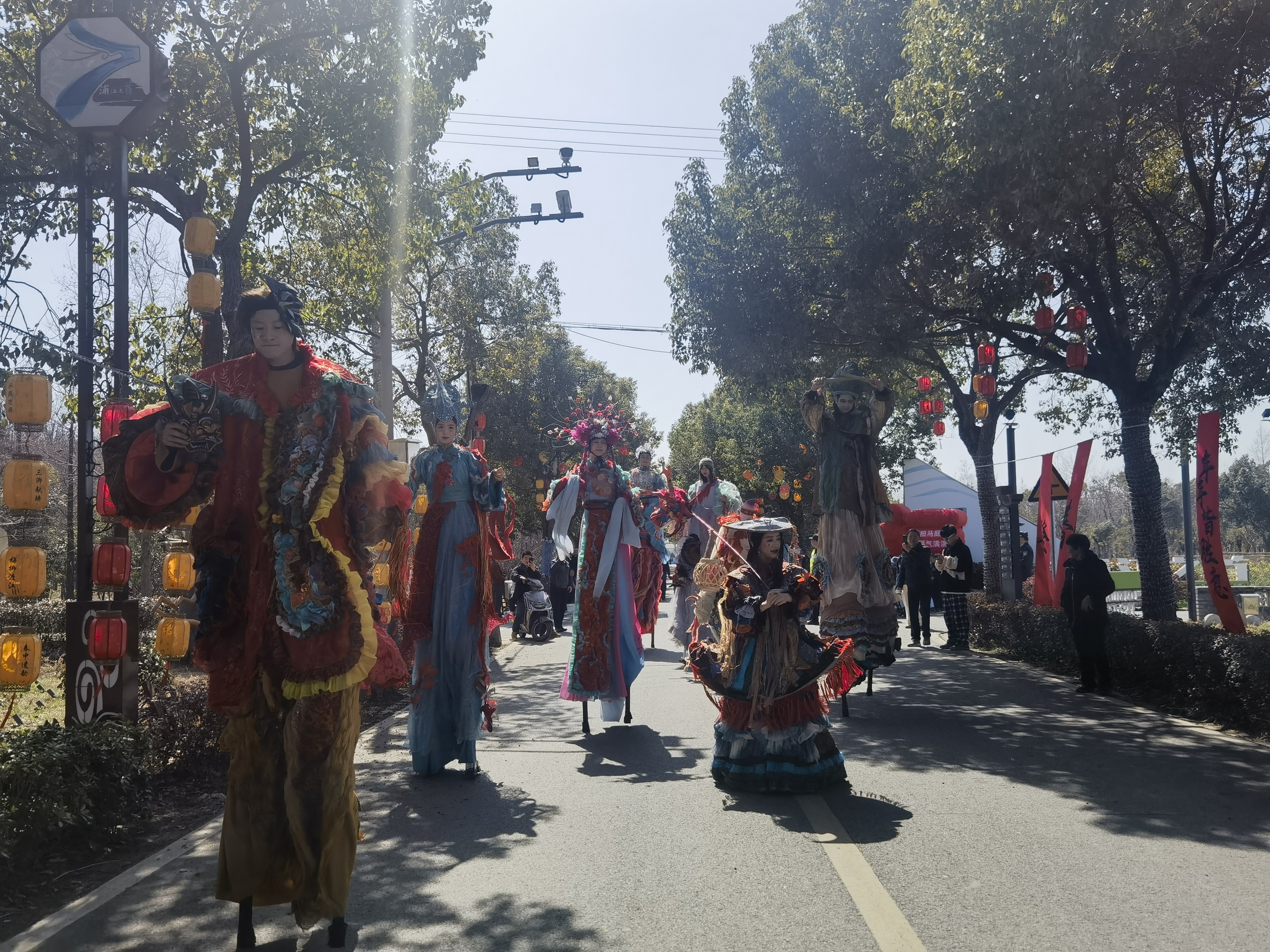 中午12时,在石湖荡镇有米社区,餐厅里已是高朋满座,热闹非凡。不一会儿,今天的主角便闪亮登场。一支表演队在乡间小道上缓缓巡游,迎接财神,演员们身着鲜艳的服饰、踩着高跷,可爱的造型和灵动的舞姿吸引了不少游客驻足围观、拍照纪念。“第一次过来,今天正好也蛮巧,碰到村里组织这样的活动,非常有年味,很赞。”游客任女士感叹。