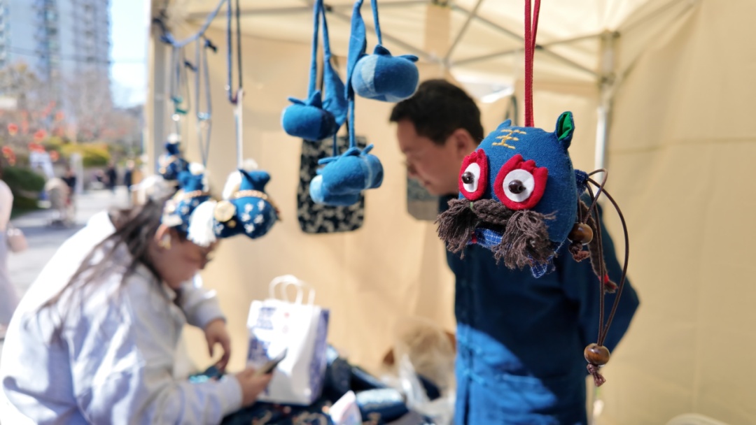 市集现场,40余个特色摊位次第排开,宛如一幅流动的民俗画卷。来自扬州的吹糖人传承人陈宵俯身帮助小朋友吹制糖人,麦芽糖在指尖瞬间鼓胀成憨态可掬的小马。“糖人讲究手法和温度,这门手艺在扬州传了几百年了。”他一边搓着糖人一边说道。