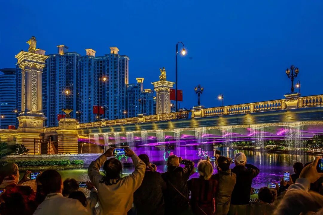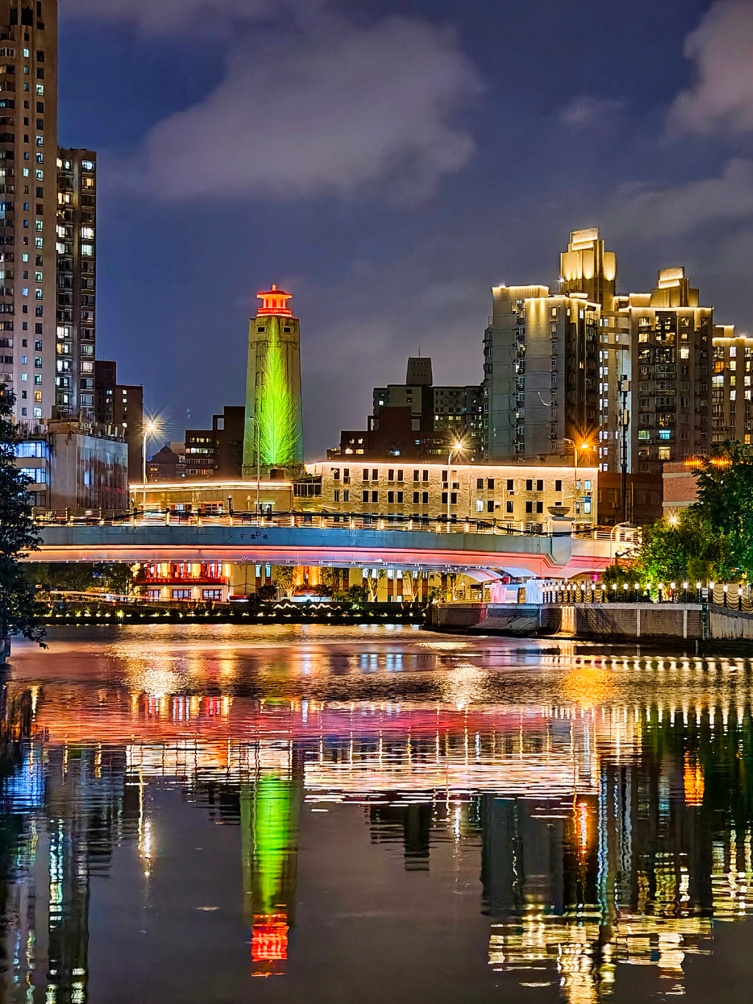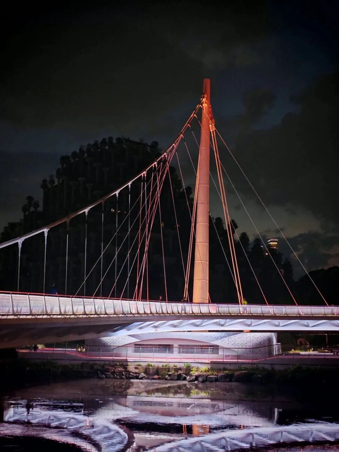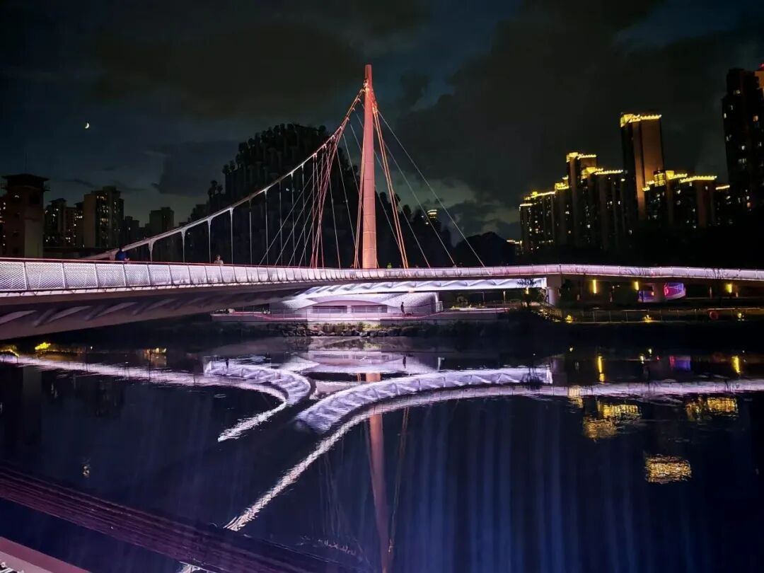 待到夜晚,桥上灯光亮起,光影倒映在河面上,波光粼粼,仿佛两个平行世界在此交汇,浪漫又梦幻。