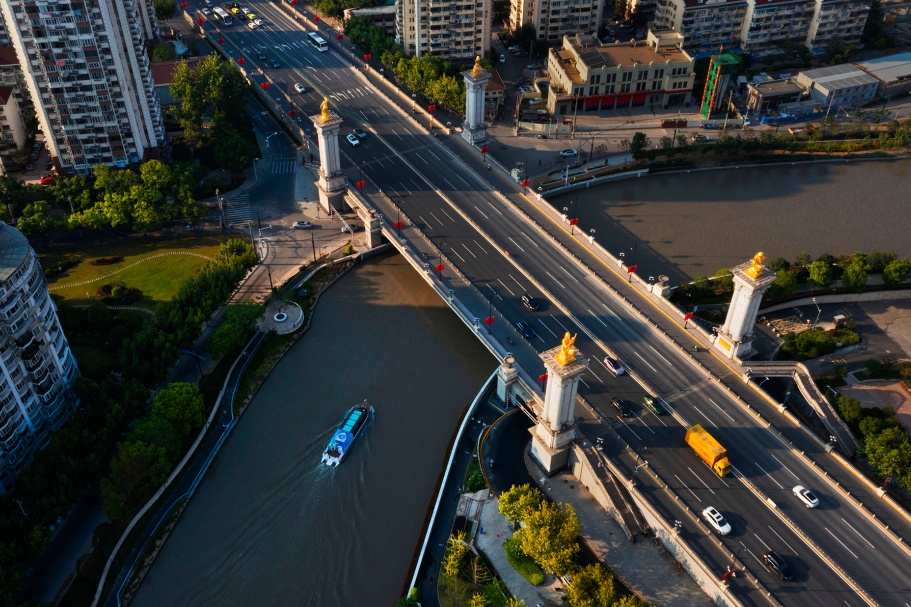 武宁路桥的设计从巴黎亚历山大三世桥汲取灵感,又融入满满的中国传统文化元素,堪称“中西合璧”的典范。4座27米高的艾奥尼克式桥头堡气势恢宏,顶部贴金铜雕以“孕育、萌芽、成长、希望”四组母子主题,隐喻苏州河的“母亲河”使命。