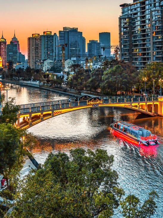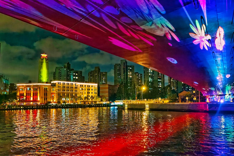 作为上海首座跨苏州河灯光水幕景观桥,夜幕降临时,灯光与水幕交织变幻,现代科技与历史建筑完美融合,随手一拍都是大片质感。
