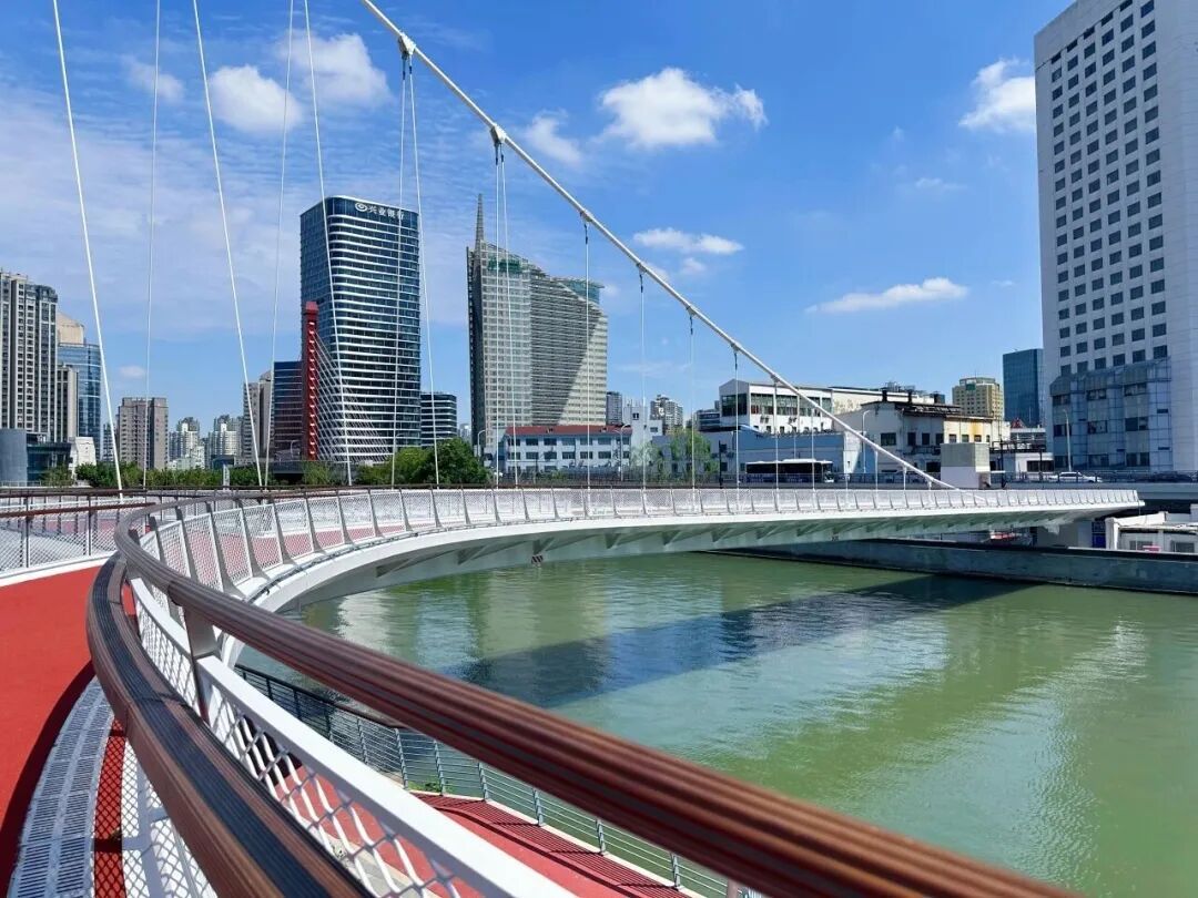 苏州河上首座独塔悬索桥——百合桥,不仅是便捷的跨河通道,更是绝佳的拍照点位。桥梁设计简约大气,行走其上,两岸风光尽收眼底。