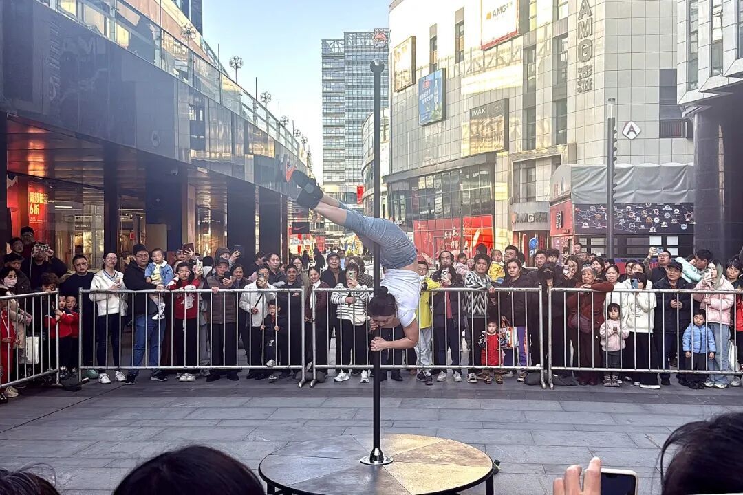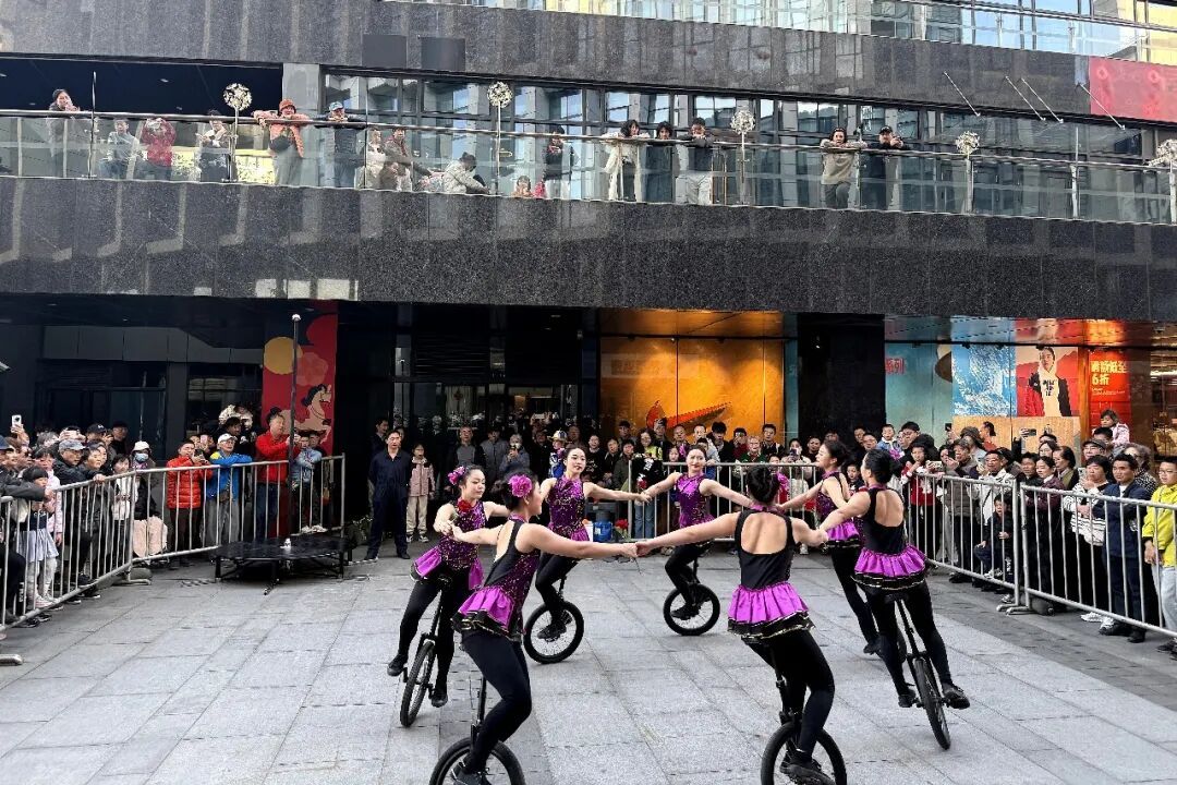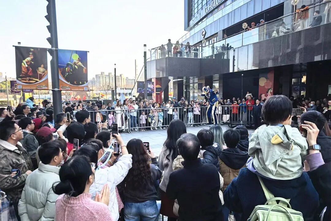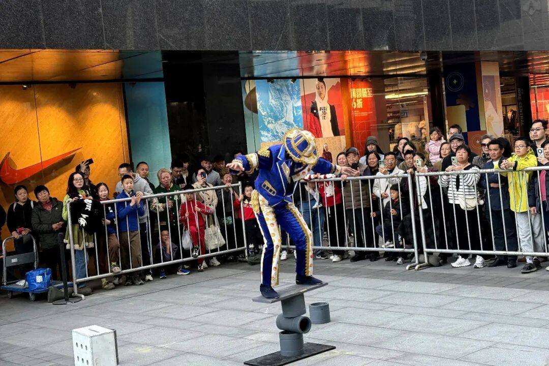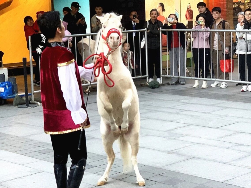 如果说上午是传统年味的温情,下午则变成了惊喜欢呼的海洋。作为静安区“奔马戏春风”系列活动的重头戏,4点35分,“策马迎新,邂逅静安——奔马戏春风”商圈春节演艺快闪活动在大宁音乐广场准时上演。
