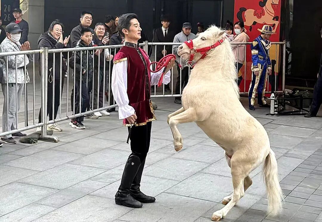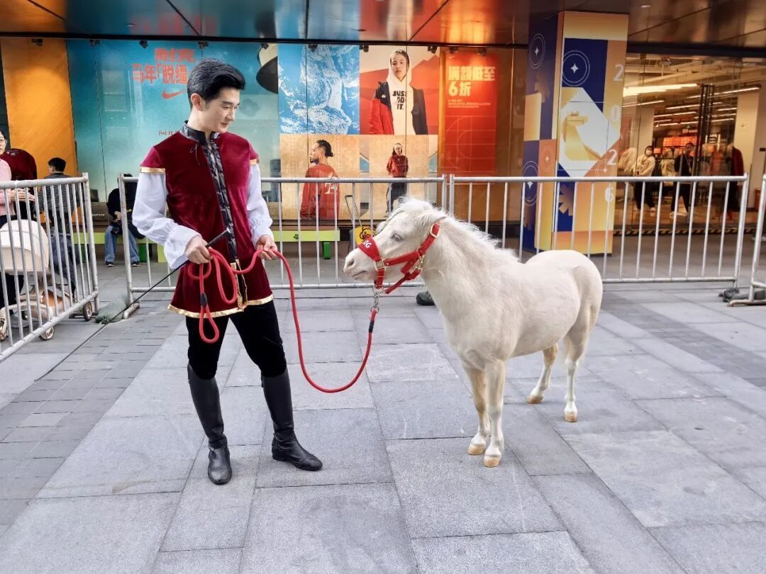 活动以“乐动马年,好事发生”为主题,上海马戏城的专业团队刚一登场,便吸引了全场目光。而最让人挪不开眼的,无疑是那位特别的“主角”——舍特兰小矮马“雪球”。当它迈着呆萌的小碎步来到广场中央,圆滚滚的身材配上温顺的眼神,分分钟俘获全场。