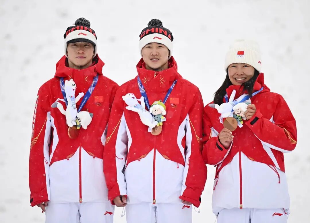 经过激烈争夺,由徐梦桃、王心迪、李天马组成的中国队收获季军。至此,本届冬奥会自由式滑雪空中技巧项目收官,中国队收获2金3铜。