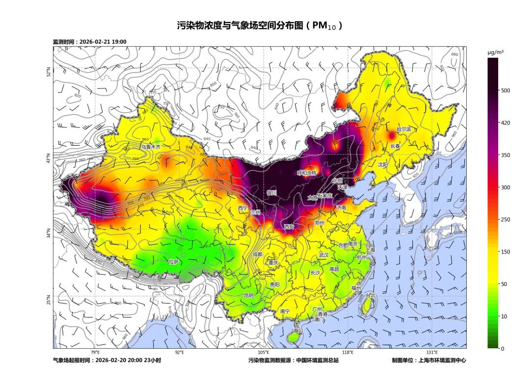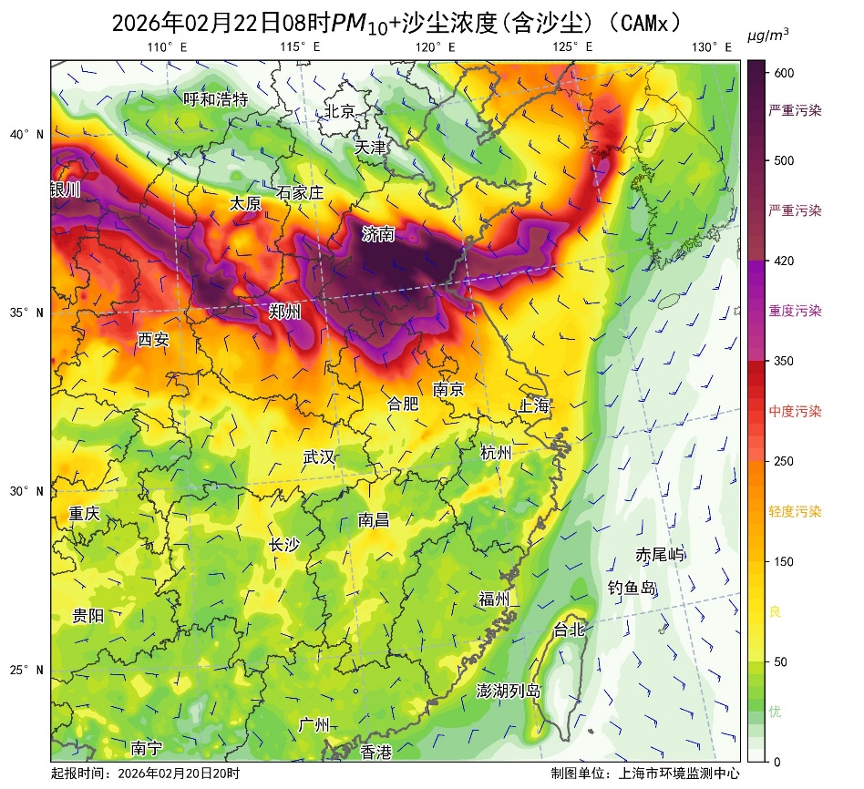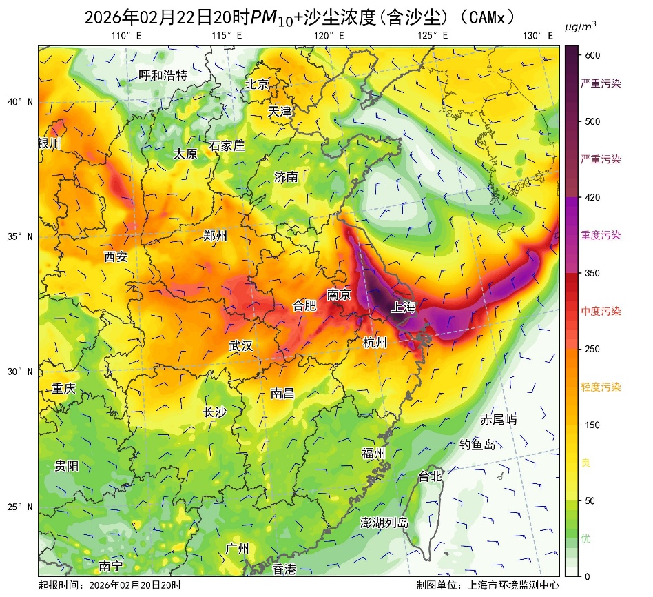 2月21日,我国西北地区出现大范围沙尘天气,多地出现重度至严重污染水平。根据预测,22日凌晨起,沙尘气团开始影响长三角地区,预计中午前后影响本市,出现短时中度及以上污染过程;23日凌晨,本市主导风向转为东北风,沙尘气团逐渐过境,中午前后沙尘影响基本结束,空气质量好转为优良。