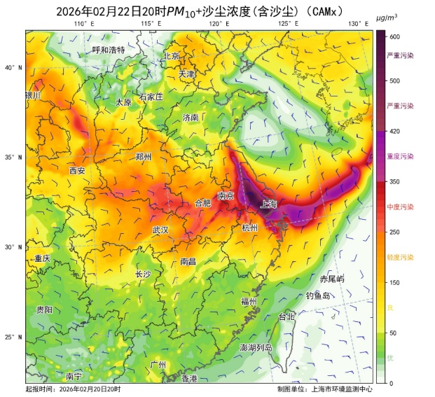 市生态环境局介绍,2月21日,我国西北地区出现大范围沙尘天气,多地出现重度至严重污染水平。根据最新预测预报情况,22日凌晨起,沙尘气团开始影响长三角地区,预计中午前后影响本市,出现短时中度及以上污染过程;23日凌晨,本市主导风向转为东北风,沙尘气团逐渐过境,中午前后沙尘影响基本结束,空气质量好转为优良。