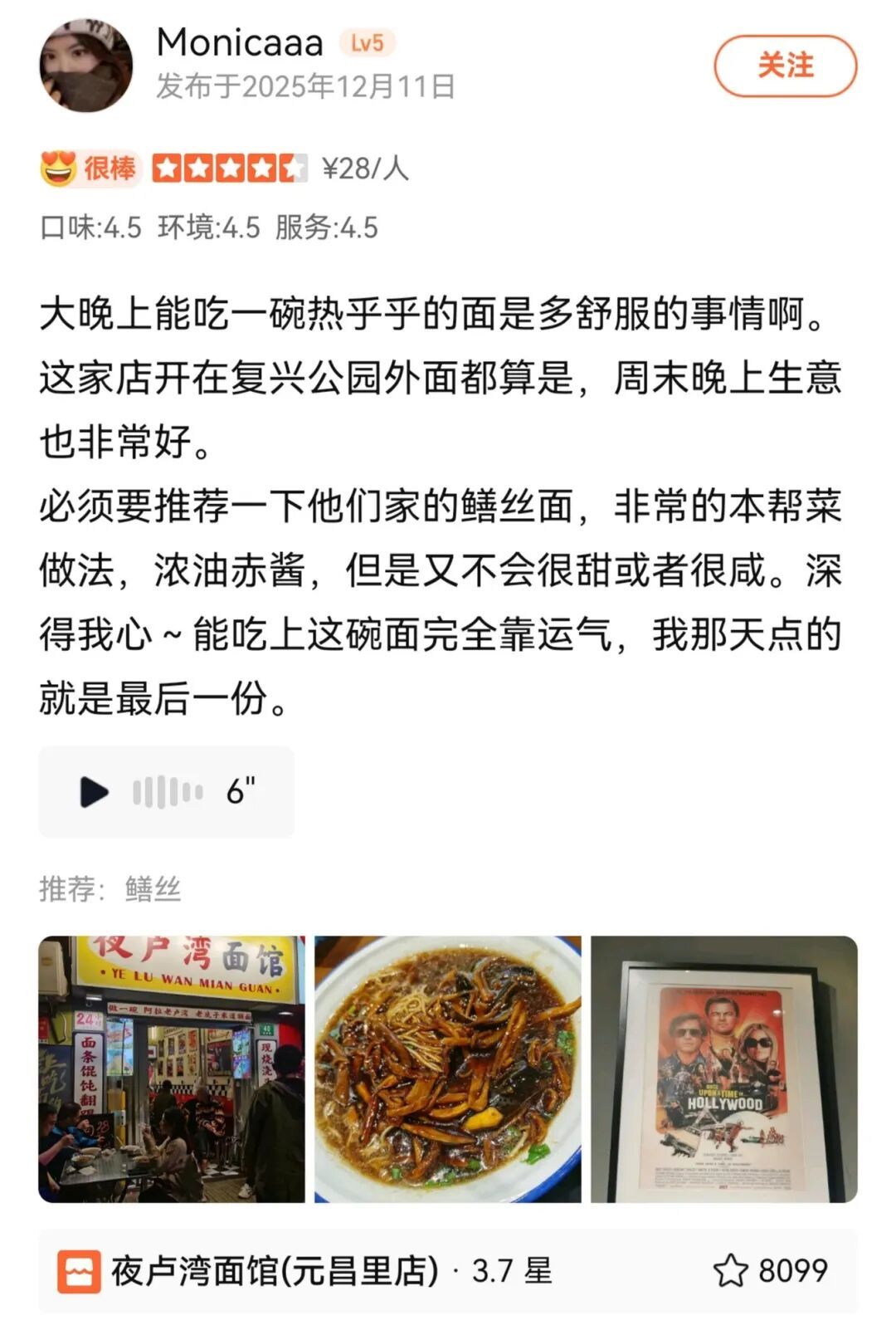 夜卢湾做的是“冷浇头”工艺——浇头提前烧好放凉,面条单独煮,保证入口爽利不糊。老白说:“我们延续的是老上海面馆的传统做法,很多客人告诉我,这味道和他们小时候吃的一模一样。”