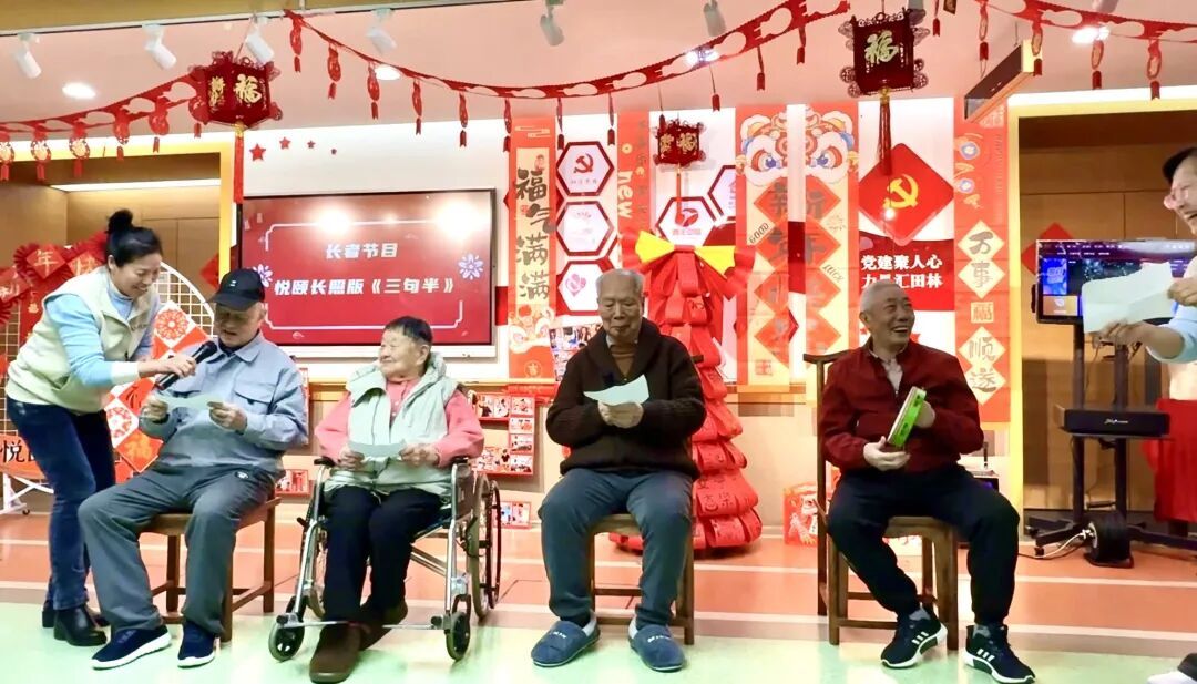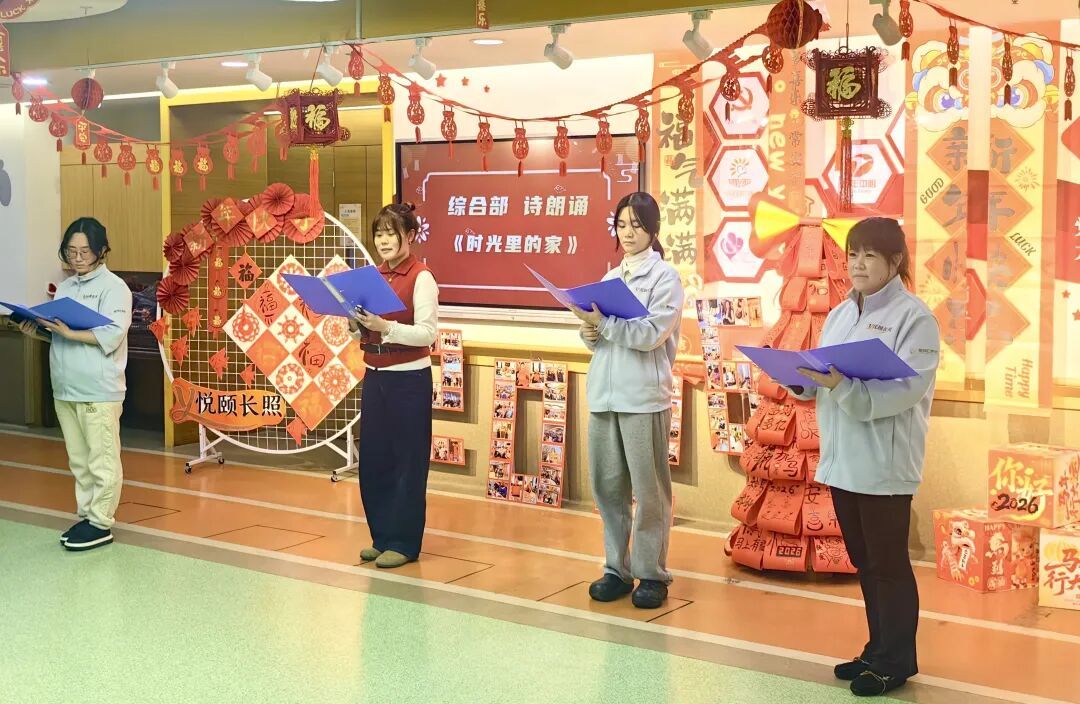 春节假期期间,在徐汇区国企新徐汇养老旗下运营的养老机构里,一场场“团圆宴”悄然开席。对于入住在这里的长者们而言,春节的含义被重新定义,不再仅仅是等待子女探望的一天,而是登台亮相、共同创造节日记忆的高光时刻。 在悦颐长者照护之家,82岁的李爷爷一大早就把红围巾系得整整齐齐。这一天他不再是观众,而是演员。由他和几位老人自编自演的《三句半》,用最朴实的语言讲述着日常的作息与养生心得。朴素的词句配上诙谐的表演瞬间点燃了“瑞岁启马年·团圆贺新春”联欢会的现场气氛。 长者们表演《三句半》 这场联欢会与往常有所不同。它并非一场慰问演出,而是一场“由长者共创”的团圆聚会。主办方邀请了接受家庭照护床位的长者们走出家门,感受大家庭的温暖。一位受邀而来的长者客串起了摄影师,并感慨道:“我来这里看到如此热闹的场面,心里特别感动。” 护工们朗诵散文诗《时光里的家》 在舞台上下,长者们的身影无处不在。从开场舞到压轴诗朗诵,从与护理员合唱《珊瑚颂》到吟诵《将进酒》,处处可见他们被激发出的活力与才情。一位老人将日常点滴写成了散文诗《时光里的家》,当护工们念到“我们把每一位长者,都当作父母一样。用长久的陪伴,抵御岁月的漫长”时,台下的家属们无比动容。 在长青坊长者照护之家,年味则被注入了更多青春的活力。在“福满人间迎新春”联欢会上,三只“大青蛙”随着动感的节拍蹦跳登场。这些由护工实习生们扮演的萌系玩偶,用一场“青蛙舞”引得了长者们的鼓掌以及争相合影。长者的家属对记者表示:“没想到养老院的联欢会这么潮,连我爸妈都追着‘青蛙’拍照,说这是他们感受过最有趣的年味儿。” 护工实习生为长者表演“青蛙舞” 联欢会依然保留了经典的温情底色,医护与社工团队以舞蹈《好运全都来》拉开序幕,声乐管独奏《我的祖国》唤起共同记忆,游戏环节中的踩气球、蒙眼棒战让长者与工作人员乐不可支。 台前热闹非凡,后方的厨房里同样暖意融融。大厨们从清晨便开始忙碌,用心备菜、精致摆盘,只为呈上一桌地道可口、饱含“家的味道”的年夜饭。“菜香饭暖,分量足、味道好,处处都是贴心。”家属们的夸赞是对这顿团圆饭最好的注脚。 乐龄汇养老相关负责人告诉记者:“养老机构不仅是提供照护的场所,也可以是能够让长者表达自我、被看见价值、产生归属感的‘生活共同体’,春节的年味在笑声、掌声与陪伴中更有滋味与温度。”