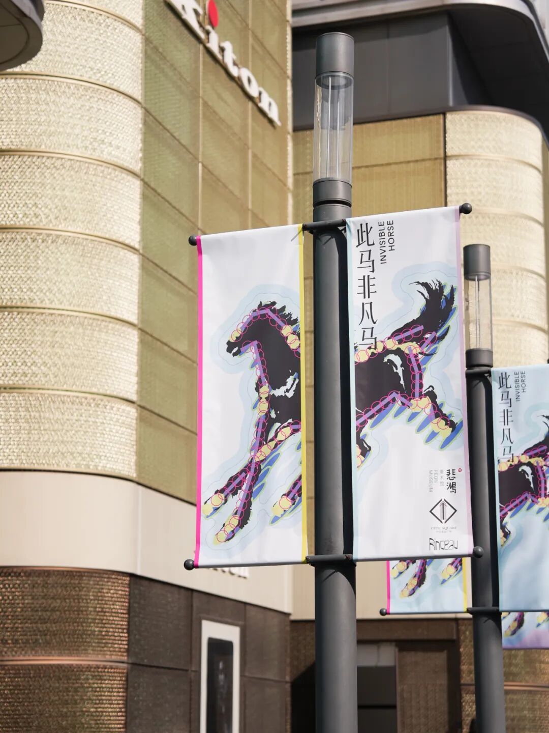 层叠的几何轮廓勾勒出骏马疾行、回望的灵动,动态镜像让光影与骏影交织。