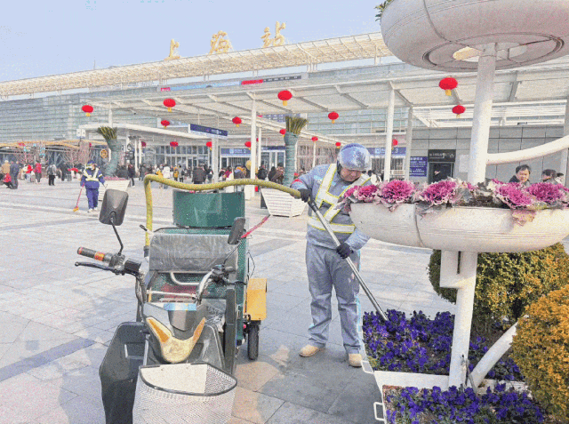 铁路上海站迎来大客流,静环作业二部实行弹性排班,在南、北广场形成“定点保洁+流动作业”立体保障网络。