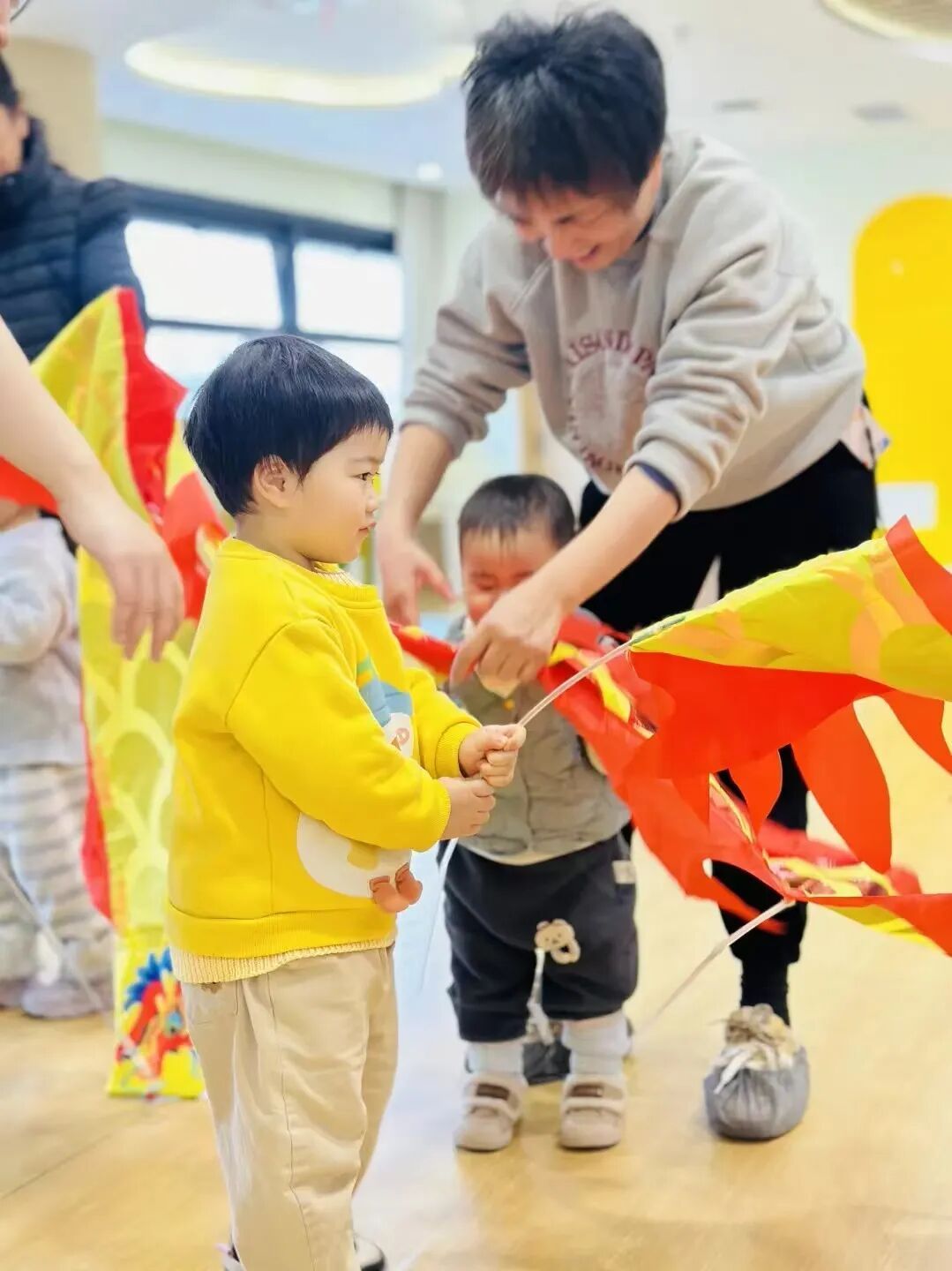锣鼓声声年味浓,小小萌娃舞长龙!孩子们化身 “小小舞龙手”,小手紧紧攥着龙身,跟着节奏迈着萌萌的小碎步,让五彩长龙在场地中穿梭摆动。在热闹的舞龙互动中,孩子们感受着传统民俗的欢乐,更锻炼了肢体协调性,小小的身影舞出满满的新年喜气。